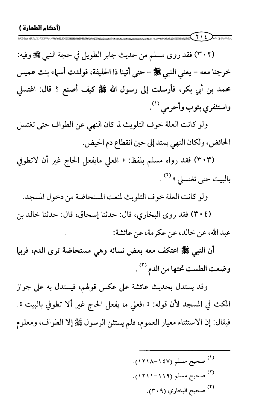 (٣٠٢) فقد روى مسلم من حديث جابر الطويل في حجة النبي -صلى الله عليه وسلم- وفيه: خرجنا معه - يعني النبي - صلى الله عليه وسلم - حتى أتينا ذا الحليفة، فولدت أسماء بنت عميس محمد بن أبي بكر، فأرسلت إلى رسول الله - صلى الله عليه وسلم - كيف أصنع؟ قال: اغتسلي واستثفري بثوب وأحرمي (¬١).