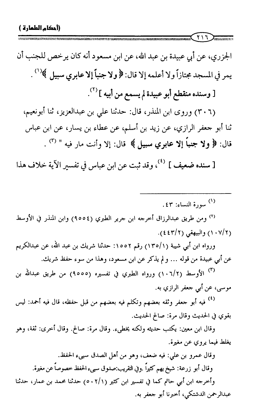 (٣٠٦) وروى ابن المنذر، قال: حدثنا علي بن عبد العزيز، ثنا أبو نعيم، ثنا أبو جعفر الرازي، عن زيد بن أسلم، عن عطاء بن يسار، عن ابن عباس قال: {وَلَا جُنُبًا إلا عَابِرِي سَبِيل} قال: إلا وأنت مار فيه" (¬٣).