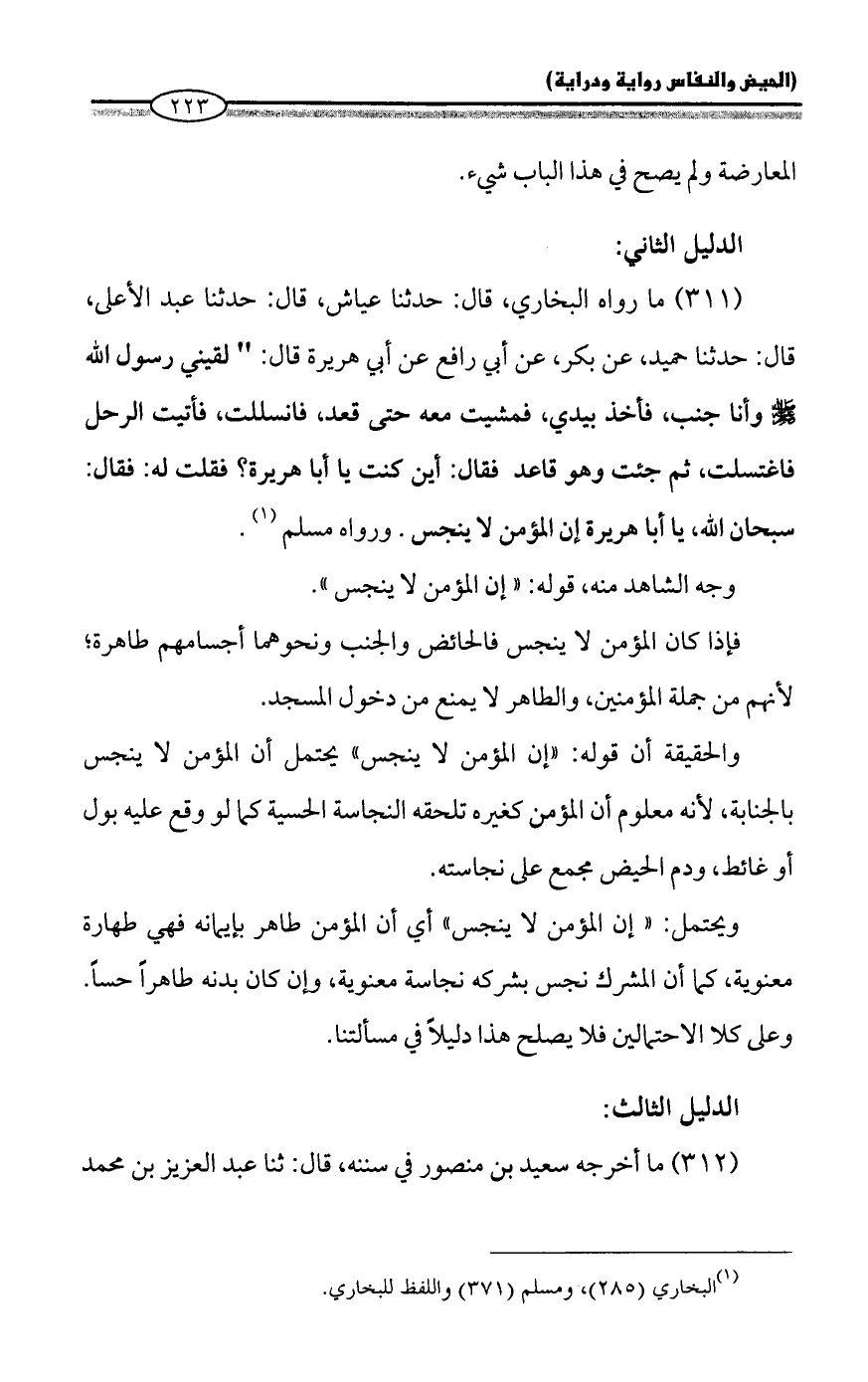 (٣١١) ما رواه البخاري، قال: حدثنا عياش، قال: حدثنا عبد الأعلى، قال: حدثنا حميد، عن بكر، عن أبي رافع عن أبي هريرة قال: "لقيني رسول الله - صلى الله عليه وسلم - وأنا جنب، فأخذ بيدي، فمشيت معه حتى قعد، فانسللت، فأتيت الرحل فاغتسلت، ثم جئت وهو قاعد فقال: أين كنت يا أبا هريرة؟ فقلت له: فقال: سبحان الله، يا أبا هريرة إن المؤمن لا ينجس. ورواه مسلم (¬١).