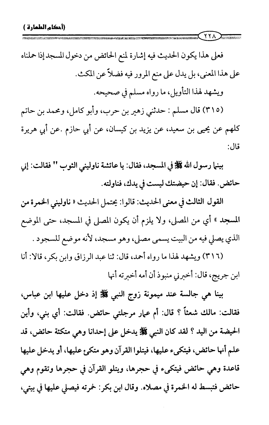بينا هي جالسة عند ميمونة زوج النبي - صلى الله عليه وسلم - إذ دخل عليها ابن عباس، فقالت: مالك شعثاً؟ قال: أم عمار مرجلتي حائض. فقالت: أي بني، وأين الحيضة من اليد؟ لقد كان النبي - صلى الله عليه وسلم - يدخل على إحدانا وهي متكئة حائض، قد علم أنها حائض، فيتكئ عليها، فيتلوا القرآن وهو متكئ عليها، أو يدخل عليها قاعدة وهي حائض فيتكئ في حجرها، ويتلو القرآن في حجرها وتقوم وهي حائض فتبسط له الخمرة في مصلاه. وقال ابن بكر: خمرته فيصلي عليها في بيتي،
