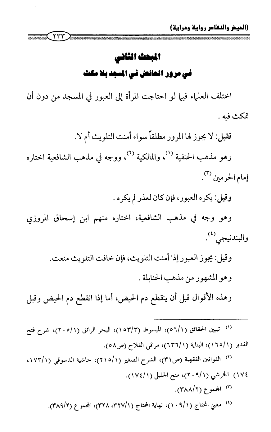 المبحث الثاني: في مرور الحائض في المسجد بلا مكث