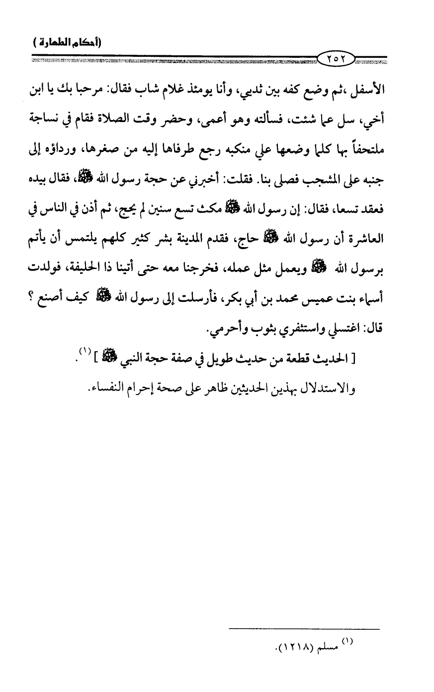 الأسفل، ثم وضع كفه بين ثديي، وأنا يومئذ غلام شاب فقال: مرحبا بك يا ابن أخي، سل عما شئت، فسألته وهو أعمى، وحضر وقت الصلاة فقام في نساجة ملتحفاً بها كلما وضعها علي منكبه رجع طرفاها إليه من صغرها، ورداؤه إلى جنبه على المشجب فصلى بنا. فقلت: أخبرني عن حجة رسول الله - صلى الله عليه وسلم -، فقال بيده فعقد تسعا، فقال: إن رسول الله - صلى الله عليه وسلم - مكث تسع سنين لم يحج، ثم أذن في الناس في العاشرة أن رسول الله - صلى الله عليه وسلم -حاج، فقدم المدينة بشر كثير كلهم يلتمس أن يأتم برسول الله - صلى الله عليه وسلم - ويعمل مثل عمله، فخرجنا معه حتى أتينا ذا الحليفة، فولدت أسماء بنت عميس محمد بن أبي بكر، فأرسلت إلى رسول الله - صلى الله عليه وسلم - كيف أصنع؟ قال: اغتسلي واستثفري بثوب وأحرمي.