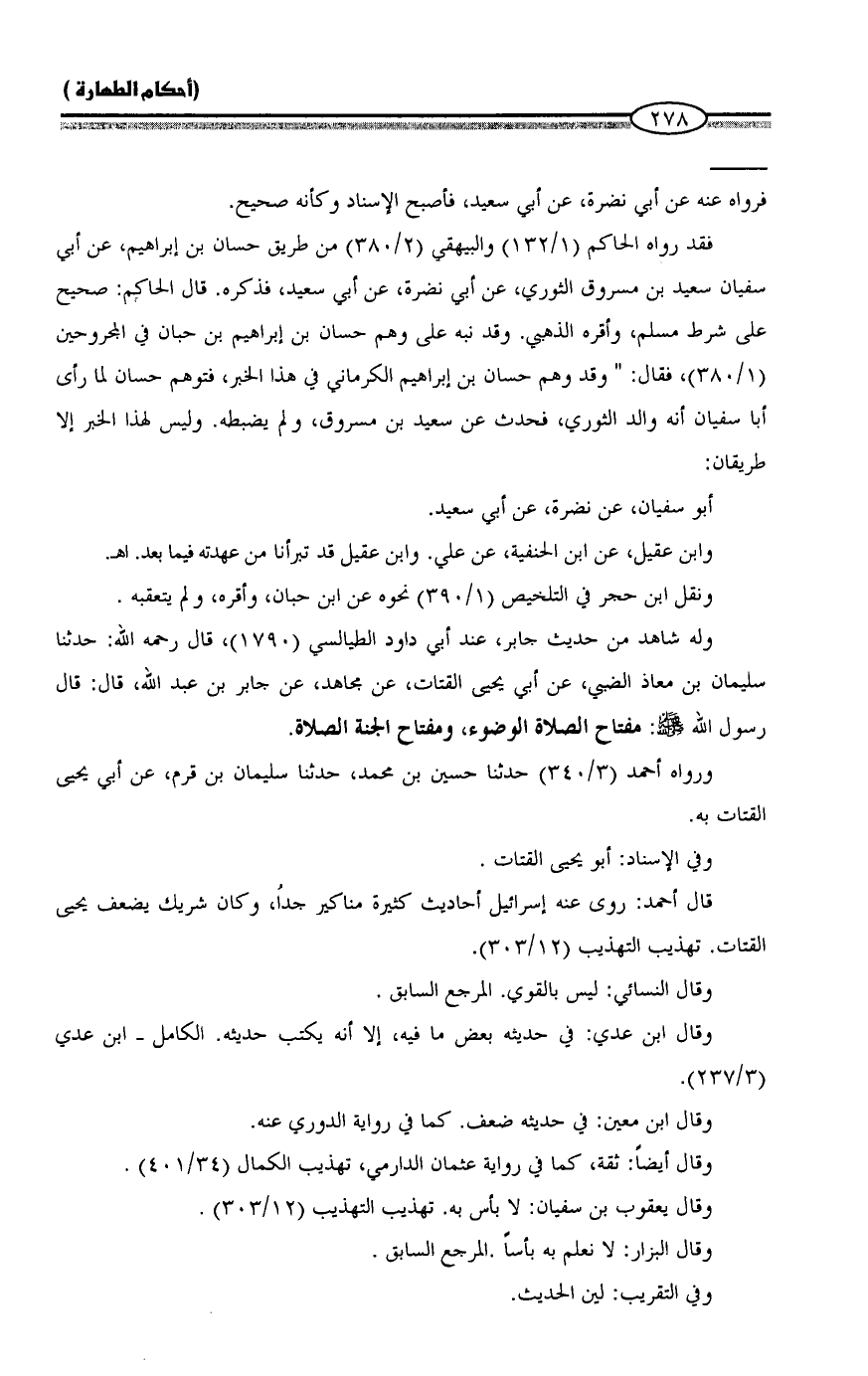 فقد رواه الحاكم (١/ ١٣٢) والبيهقي (٢/ ٣٨٠) من طريق حسان بن إبراهيم، عن أبي سفيان سعيد بن مسروق الثوري، عن أبي نضرة، عن أبي سعيد، فذكره. قال الحاكم: صحيح على شرط مسلم، وأقره الذهبي. وقد نبه على وهم حسان بن إبراهيم بن حبان في المجروحين (١/ ٣٨٠)، فقال: "وقد وهم حسان بن إبراهيم الكرماني في هذا الخبر، فتوهم حسان لما رأى أبا سفيان أنه والد الثوري، فحدث عن سعيد بن مسروق، ولم يضبطه. وليس لهذا الخبر إلا طريقان: