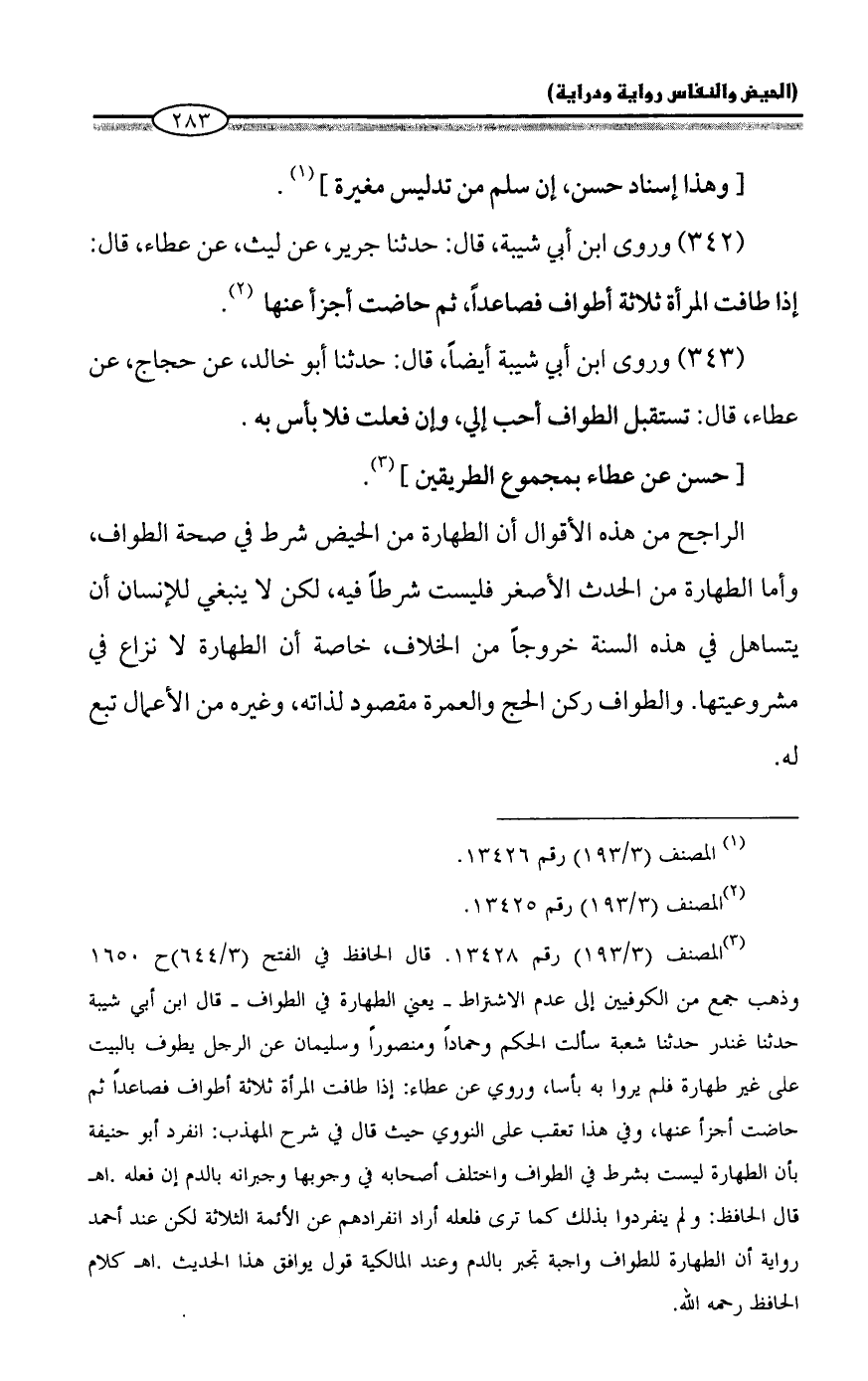 (¬٣) المصنف (٣/ ١٩٣) رقم ١٣٤٢٨. قال الحافظ في الفتح (٣/ ٦٤٤) ح ١٦٥٠ وذهب جمع من الكوفيين إلى عدم الاشتراط - يعني الطهارة في الطواف - قال ابن أبي شيبة حدثنا غندر حدثنا شعبة سألت الحكم وحماداً ومنصوراً وسليمان عن الرجل يطوف بالبيت على غير طهارة فلم يروا به بأسا، وروي عن عطاء: إذا طافت المرأة ثلاثة أطواف فصاعداً ثم حاضت أجزأ عنها، وفي هذا تعقب على النووي حيث قال في شرح المهذب: انفرد أبو حنيفة بأن الطهارة ليست بشرط في الطواف واختلف أصحابه في وجوبها وجبرانه بالدم إن فعله. اهـ قال الحافظ: ولم ينفردوا بذلك كما ترى فلعله أراد انفرادهم عن الأئمة الثلاثة لكن عند أحمد رواية أن الطهارة للطواف واجبة تجبر بالدم وعند المالكية قول يوافق هذا الحديث. اهـ كلام الحافظ رحمه الله.