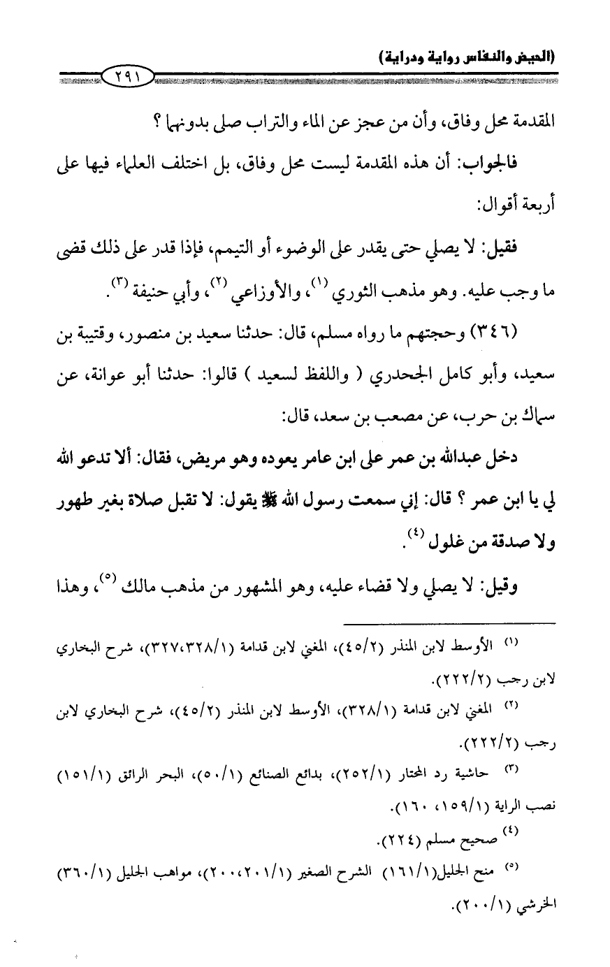 (¬١) الأوسط لابن المنذر (٢/ ٤٥)، المغني لابن قدامة (١/ ٣٢٨, ٣٢٧)، شرح البخاري لابن رجب (٢/ ٢٢٢).