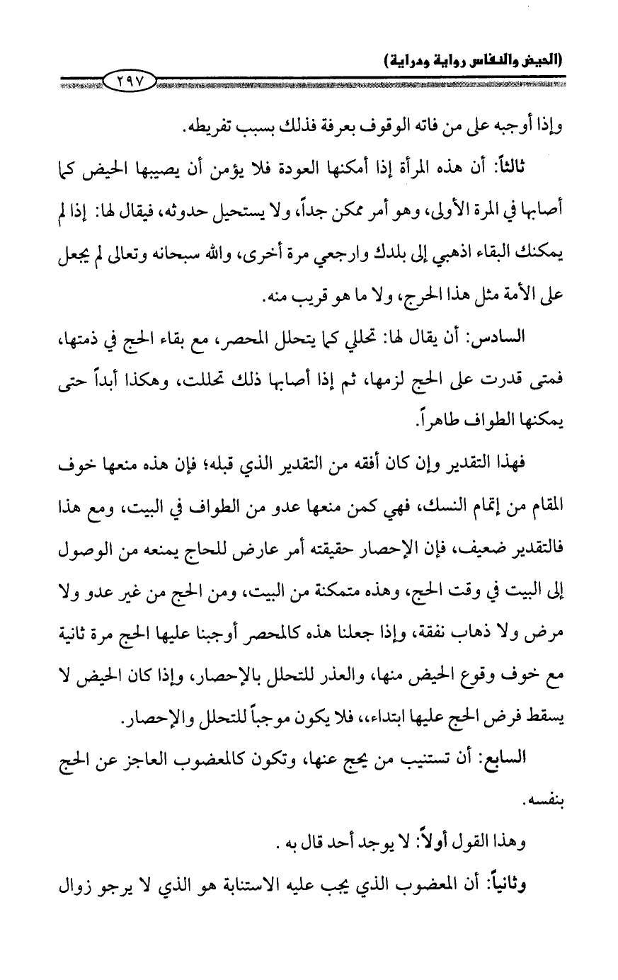 السادس: أن يقال لها: تحللي كما يتحلل المحصر، مع بقاء الحج في ذمتها، فمتى قدرت على الحج لزمها، ثم إذا أصابها ذلك تحللت، وهكذا أبداً حتى يمكنها الطواف طاهراً.