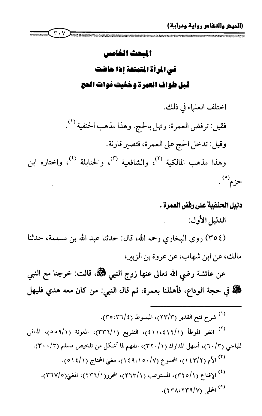 المبحث الخامس: في المرأة المتمتعة إذا حاضت قبل طواف العمرة وخشيت فوات الحج