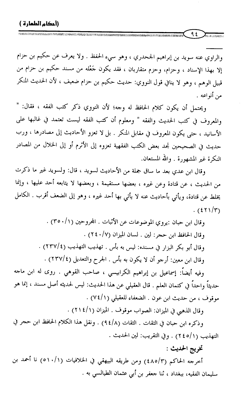 والراوي عنه سويد بن إبراهيم الجحدري، وهو سيء الحفظ. ولا يعرف عن حكيم بن حزام إلا بهذا الإسناد، وحزام، وحزم متقاربان، فقد يكون جَعْله من مسند حكيم بن حزام من قبيل الوهم، وهو لا ينافي قول النووي: حديث حكيم بن حزام ضعيف، لأن الحديث النكر من أنواعه.