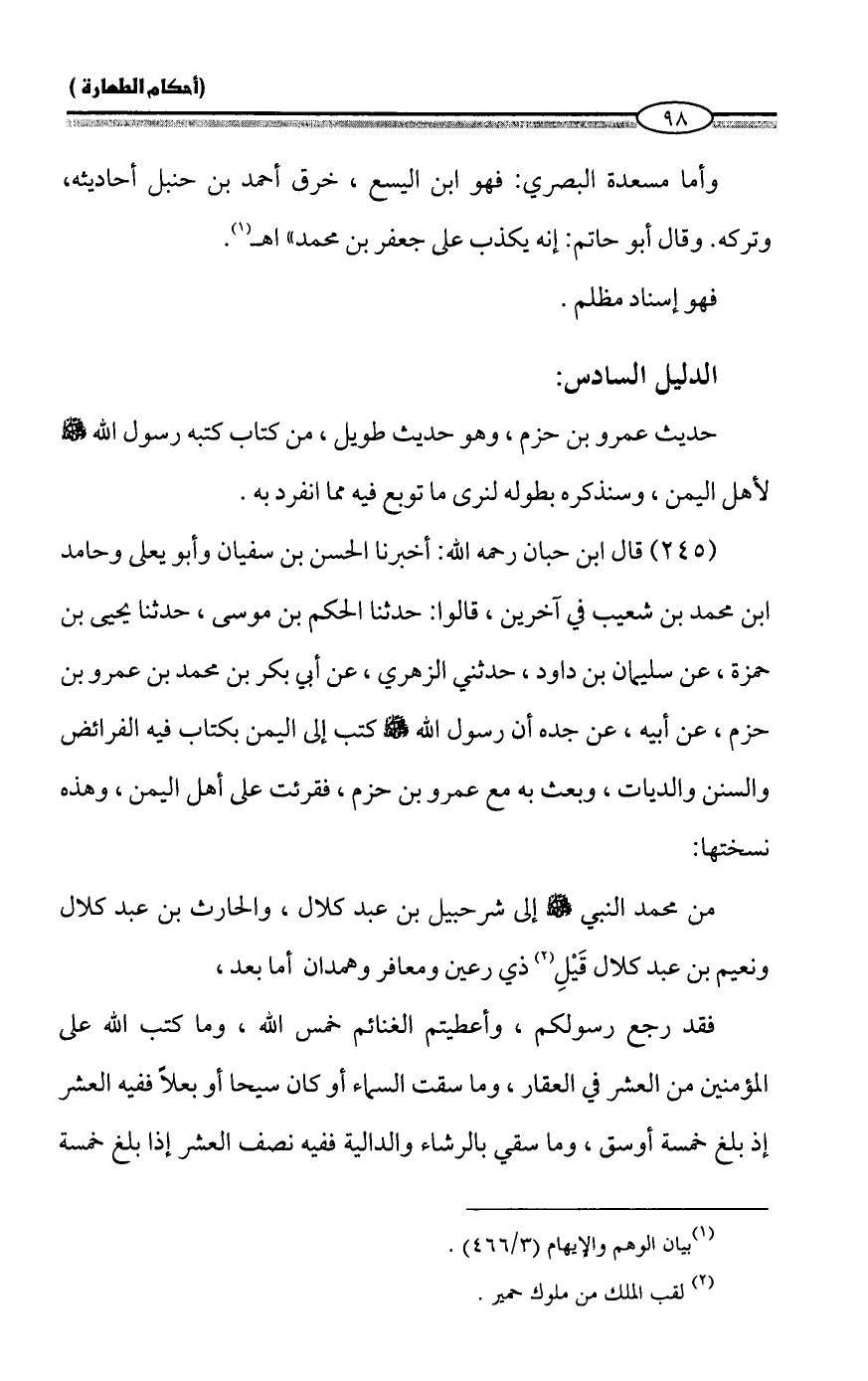 (٢٤٥) قال ابن حبان رحمه الله: أخبرنا الحسن بن سفيان وأبو يعلى وحامد ابن محمد بن شعيب في آخرين، قالوا: حدثنا الحكم بن موسى، حدثنا يحيى بن حمزة، عن سليمان بن داود، حدثني الزهري، عن أبي بكر بن محمد بن عمرو بن حزم، عن أبيه، عن جده أن رسول الله - صلى الله عليه وسلم - كتب إلى اليمن بكتاب فيه الفرائض والسنن والديات، وبعث به مع عمرو بن حزم، فقرئت على أهل اليمن، وهذه نسختها:
