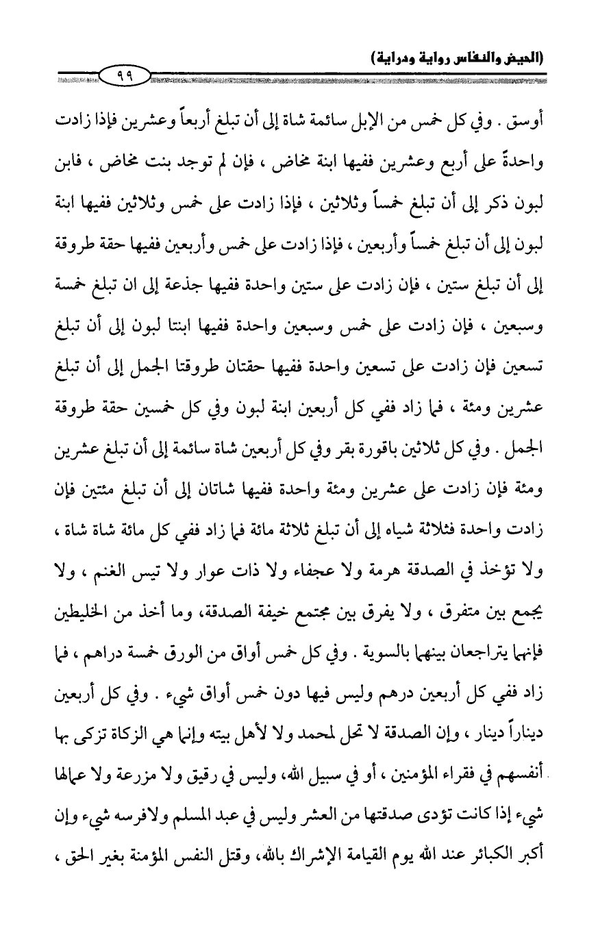 أوسق. وفي كل خمس من الإبل سائمة شاة إلى أن تبلغ أربعاً وعشرين فإذا زادت واحدةً على أربع وعشرين ففيها ابنة مخاض، فإن لم توجد بنت مخاض، فابن لبون ذكر إلى أن تبلغ خمساً وثلاثين، فإذا زادت على خمس وثلاثين ففيها ابنة لبون إلى أن تبلغ خمساً وأربعين، فإذا زادت على خمس وأربعين ففيها حقة طروقة إلى أن تبلغ ستين، فإن زادت على ستين واحدة ففيها جذعة إلى أن تبلغ خمسة وسبعين، فإن زادت على خمس وسبعين واحدة ففيها ابنتا لبون إلى أن تبلغ تسعين فإن زادت على تسعين واحدة ففيها حقتان طروقتا الجمل إلى أن تبلغ عشرين ومئة، فما زاد ففي كل أربعين ابنة لبون وفي كل خمسين حقة طروقة الجمل. وفي كل ثلاثين باقورة بقر وفي كل أربعين شاة سائمة إلى أن تبلغ عشرين ومئة فإن زادت على عشرين ومئة واحدة ففيها شاتان إلى أن تبلغ مئتين فإن زادت واحدة فثلاثة شياه إلى أن تبلغ ثلاثة مائة فما زاد ففي كل مائة شاة شاة، ولا تؤخذ في الصدقة هرمة ولا عجفاء ولا ذات عوار ولا تيس الغنم، ولا يجمع بين متفرق، ولا يفرق بين مجتمع خيفة الصدقة، وما أخذ من الخليطين فإنهما يتراجعان بينهما بالسوية. وفي كل خمس أواق من الورق خمسة دراهم، فما زاد ففي كل أربعين درهم وليس فيها دون خمس أواق شيء. وفي كل أربعين ديناراً دينار، وإن الصدقة لا تحل لمحمد ولا لأهل بيته وإنما هي الزكاة تزكى بها أنفسهم في فقراء المؤمنين، أو في سبيل الله، وليس في رقيق ولا مزرعة ولا عمالها شيء إذا كانت تؤدي صدقتها من العشر وليس في عبد المسلم ولا فرسه شيء وإن أكبر الكبائر عند الله يوم القيامة الإشراك بالله، وقتل النفس المؤمنة بغير الحق،