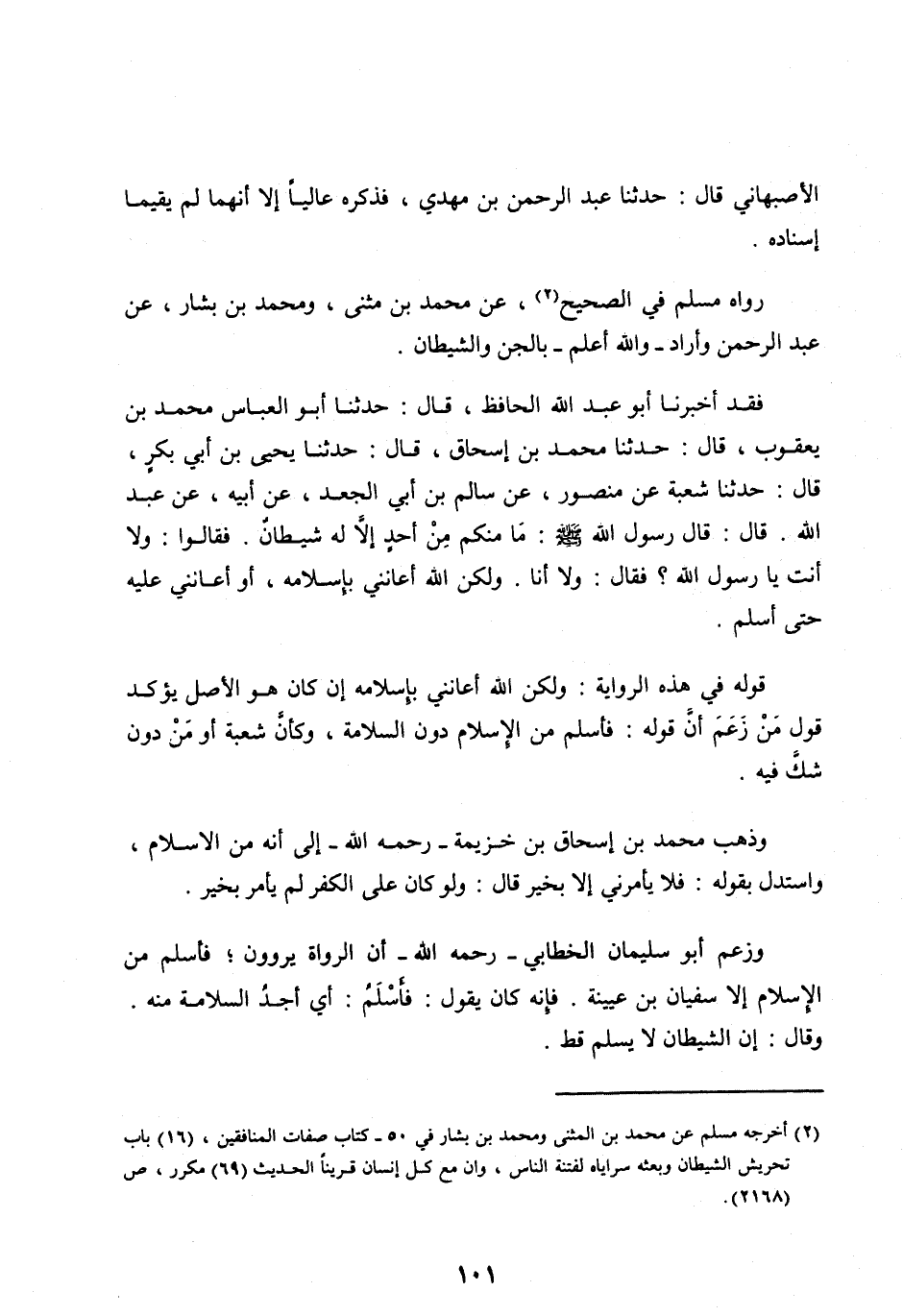 [ (2) ] أخرجه مُسْلِمٌ عَنْ مُحَمَّدِ بْنِ الْمُثَنَّى وَمُحَمَّدِ بْنِ بَشَّارٍ في 50- كتاب صفات المنافقين، (16) باب تحريش الشيطان وبعثه سراياه لفتنة الناس، وان مع كل إنسان قرينا الحديث (69) مكرر، ص (2168) .