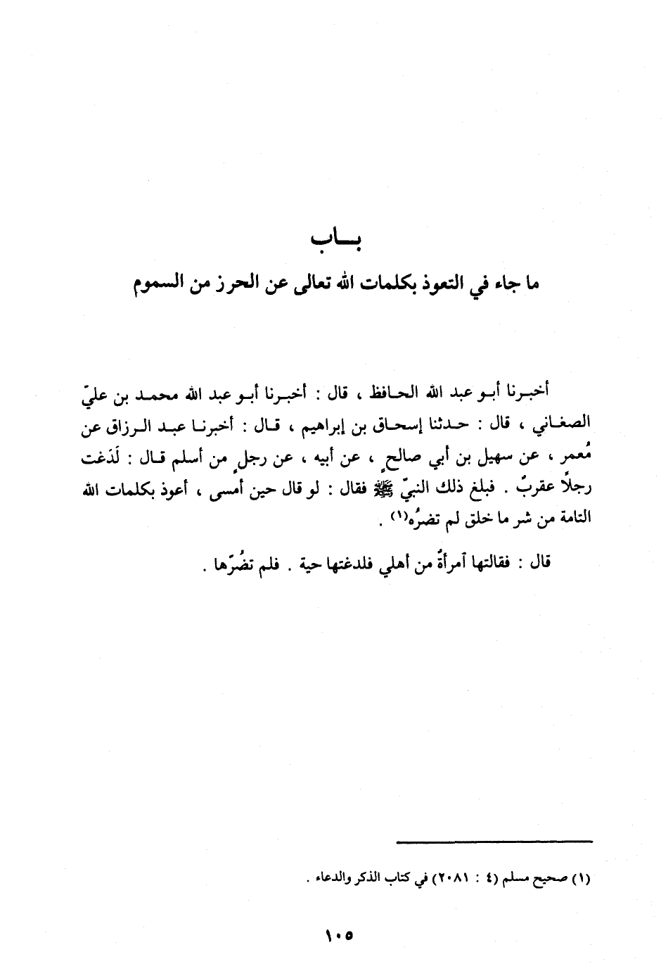 أَخْبَرَنَا أَبُو عَبْدِ اللهِ الْحَافِظُ، قَالَ: أَخْبَرَنَا أَبُو عَبْدِ اللهِ مُحَمَّدُ بْنُ عَلِيٍّ الصَّغَانِيُّ، قَالَ: حَدَّثَنَا إِسْحَاقُ بْنُ إِبْرَاهِيمَ، قَالَ: أَخْبَرَنَا عَبْدُ الرَّزَّاقِ عَنْ مَعْمَرٍ، عَنْ سُهَيْلُ بْنُ أَبِي صَالِحٍ، عَنْ أَبِيهِ، عَنْ رَجُلٍ مِنْ أَسْلَمَ قَالَ: لَدَغَتْ رَجُلًا عَقْرَبٌ. فَبَلَغَ ذَلِكَ النَّبِيَّ صَلَّى اللهُ عَلَيْهِ وَسَلَّمَ فَقَالَ: لَوْ قَالَ حِينَ أَمْسَى، أَعُوذُ بِكَلِمَاتِ اللهِ التَّامَّةِ مِنْ شَرِّ مَا خَلَقَ لَمْ تَضُرُّهُ
