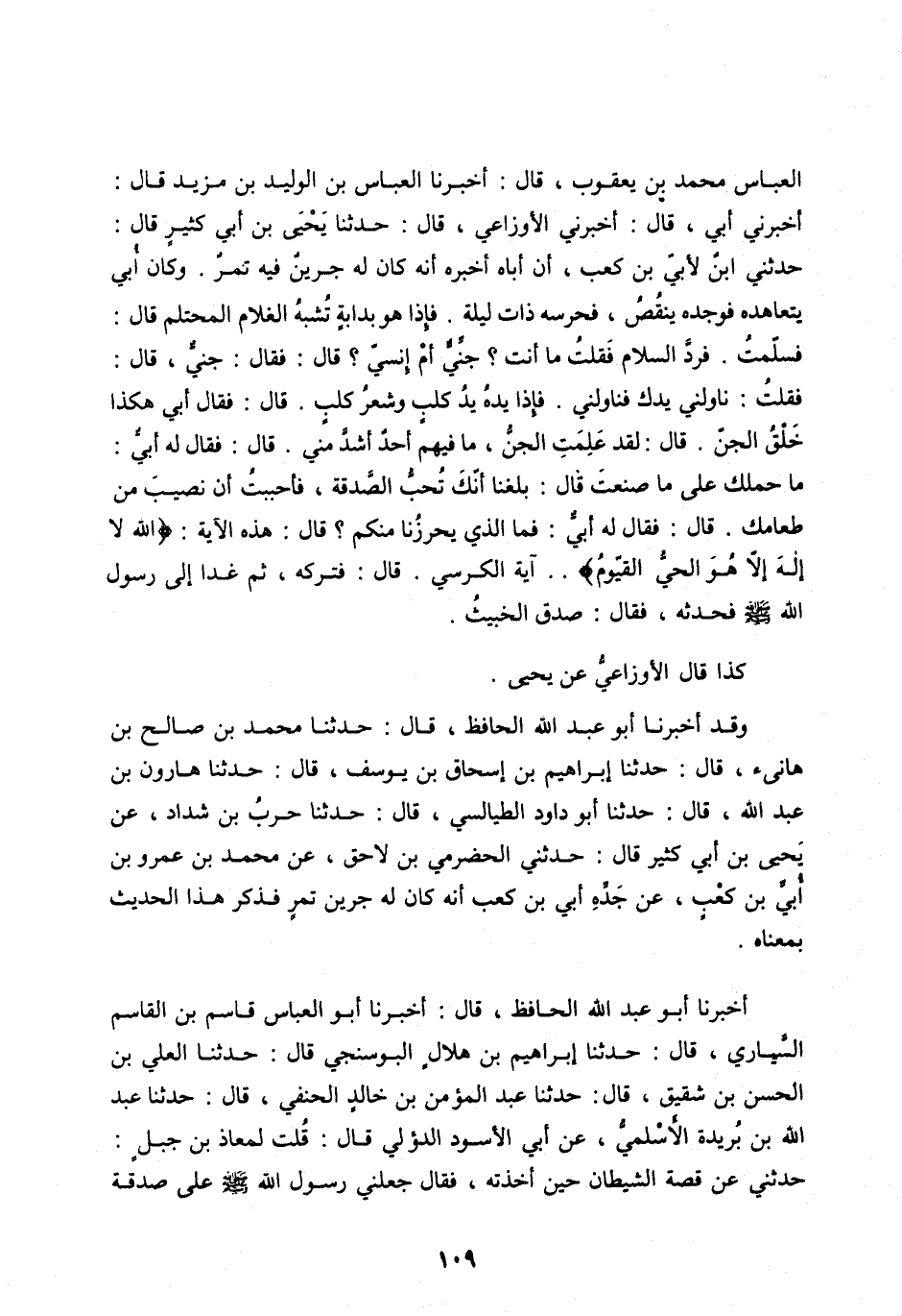 فَقُلْتُ: نَاوِلْنِي يَدَكَ فَنَاوَلَنِي. فَإِذَا يَدُهُ يَدُ كَلْبٍ وَشَعْرُ كَلْبٍ. قَالَ: فَقَالَ أُبَيٌّ هَكَذَا خَلْقُ الْجِنِّ. قَالَ: لَقَدْ عَلِمَتِ الْجِنُّ، مَا فِيهِمْ أَحَدٌ أَشَدُّ مِنِّي. قَالَ: فَقَالَ لَهُ أُبَيٌّ: