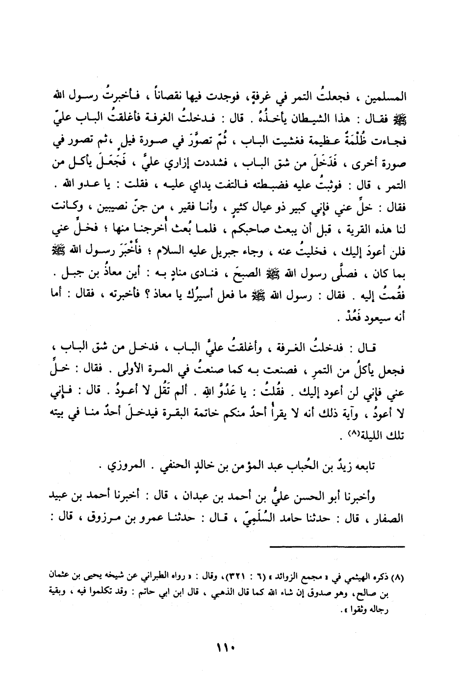 الْمُسْلِمِينَ، فَجَعَلْتُ التَّمْرَ فِي غُرْفَةٍ، فَوَجَدْتُ فِيهَا نُقْصَانًا، فَأَخْبَرْتُ رَسُولَ اللهِ صَلَّى اللهُ عَلَيْهِ وَسَلَّمَ فَقَالَ: هَذَا الشَّيْطَانُ يَأْخُذُهُ. قَالَ: فَدَخَلْتُ الْغُرْفَةَ فَأَغْلَقْتُ الْبَابَ عَلَيَّ فَجَاءَتْ ظُلْمَةٌ عَظِيمَةٌ فَغَشِيَتِ الْبَابَ، ثُمَّ تَصَوَّرَ فِي صُورَةِ فِيلٍ، ثُمَّ تَصَوَّرَ فِي صُورَةٍ أُخْرَى، فَدَخَلَ مِنْ شَقِّ الْبَابِ، فَشَدَدْتُ إِزَارِي عَلَيَّ، فَجَعَلَ يَأْكُلُ مِنَ التَّمْرِ، قَالَ: فَوَثَبْتُ عَلَيْهِ فَضَبَطْتُهُ فَالْتَفَّتْ يَدَايَ عَلَيْهِ، فَقُلْتُ: يَا عَدُوَّ اللهِ.