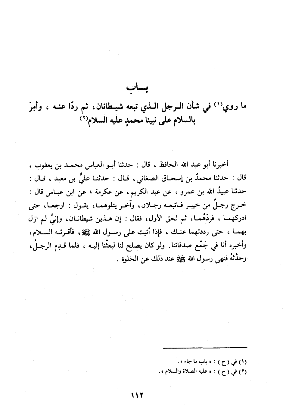 بَابُ مَا رُوِيَ [ (1) ] فِي شَأْنِ الرَّجُلِ الَّذِي تَبِعَهُ شَيْطَانَانِ، ثُمَّ رُدًّا عَنْهُ، وَأُمِرَ بِالسَّلَامِ عَلَى نَبِيِّنَا مُحَمَّدٍ عَلَيْهِ السَّلَامُ