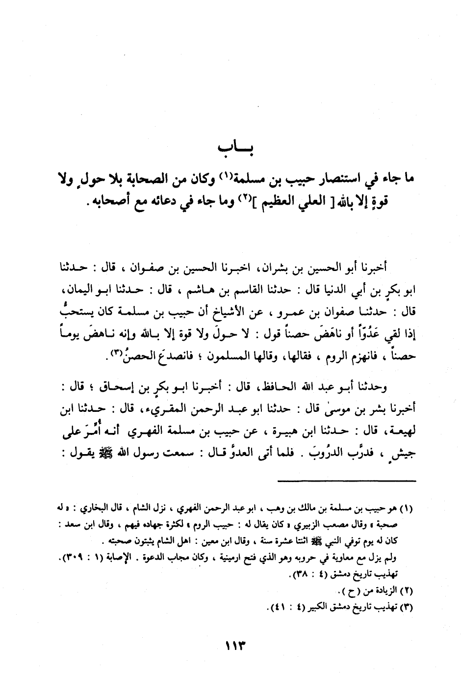 بَابُ مَا جَاءَ فِي اسْتِنْصَارِ حَبِيبِ بْنِ مَسْلَمَةَ [ (1) ] وَكَانَ مِنَ الصَّحَابَةِ بِلَا حول ولا قوة إلا بِاللهِ [الْعُلِيِّ الْعَظِيمِ] [ (2) ] وَمَا جَاءَ فِي دُعَائِهِ مَعَ أَصْحَابِهِ.