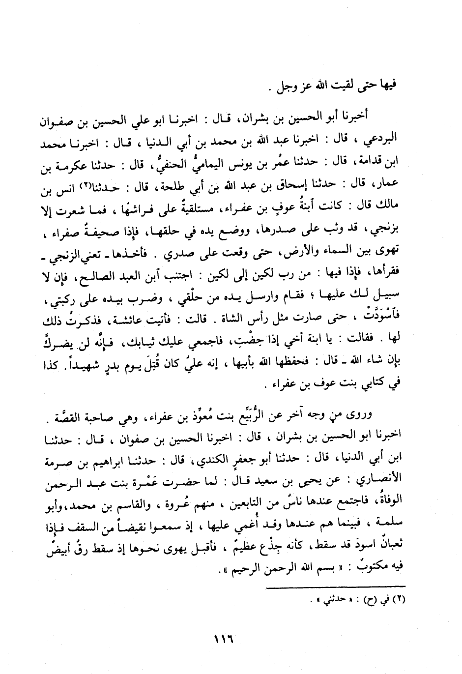 أَخْبَرَنَا أَبُو الْحُسَيْنِ بْنُ بِشْرَانَ، قَالَ: أَخْبَرَنَا أَبُو عَلِيٍّ الْحُسَيْنُ بْنُ صَفْوَانَ الْبَرْدَعِيُّ، قَالَ: أَخْبَرَنَا عَبْدُ اللهِ بْنُ مُحَمَّدِ بْنِ أَبِي الدُّنْيَا، قال: أخبرنا محمد ابن قُدَامَةَ، قَالَ: حَدَّثَنَا عُمَرُ بْنُ يُونُسَ الْيَمَامِيُّ الْحَنَفِيُّ، قَالَ: حَدَّثَنَا عِكْرِمَةُ بْنُ عَمَّارٍ، قَالَ: حَدَّثَنَا إِسْحَاقَ بْنِ عَبْدِ اللهِ بْنِ أَبِي طَلْحَةَ، قَالَ: حَدَّثَنَا [ (2) ] أَنَسُ بْنُ مَالِكٍ قَالَ: كانت ابنة عوف بن عَفْرَاءَ، مُسْتَلْقِيَةً عَلَى فِرَاشِهَا، فَمَا شَعُرَتْ إِلَّا بِزِنْجِيٍّ، قَدْ وَثَبَ عَلَى صَدْرِهَا، وَوَضَعَ يَدَهُ فِي حَلْقِهَا، فَإِذَا صَحِيفَةٌ صَفْرَاءُ، تَهْوِي بَيْنَ السَّمَاءِ وَالْأَرْضِ، حَتَّى وَقَعَتْ عَلَى صَدْرِي. فَأَخَذَهَا- تَعْنِي الزَّنْجِيُّ- فَقَرَأَهَا، فَإِذَا فِيهَا: مِنْ رَبِّ لَكِينٍ إِلَى لكين: اجتنب ابن الْعَبْدِ الصَّالِحِ، فَإِنَّ لَا سَبِيلَ لَكَ عَلَيْهَا، فَقَامَ وَأَرْسَلَ يَدَهُ مِنْ حَلْقِي، وَضَرَبَ بِيَدِهِ عَلَى رُكْبَتِي، فَاسْوَدَّتْ، حَتَّى صَارَتْ مِثْلَ رَأْسِ الشَّاةِ. قَالَتْ: فَأَتَيْتُ عَائِشَةَ، فَذَكَرْتُ ذَلِكَ لَهَا. فَقَالَتْ: يَا ابْنَةَ أَخِي إِذَا حِضْتِ، فَاجْمَعِي عَلَيْكِ ثِيَابَكِ، فَإِنَّهُ لَنْ يَضُرَّكِ بإن شَاءَ اللهُ- قَالَ: فَحَفِظَهَا اللهُ بِأَبِيهَا، إِنَّهُ عَلِيٌّ كَانَ قُتِلَ يَوْمَ بَدْرٍ شَهِيدًا. كَذَا فِي كِتَابِي بنت عوف بن عَفْرَاءَ.