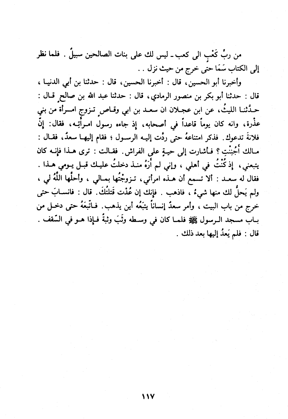 فَقَالَ لَهُ سَعْدٌ: أَلَا تَسْمَعُ أَنَّ هَذِهِ امْرَأَتِي، تَزَوَّجْتُهَا بِمَالِي، وَأَحَلَّهَا اللهُ لِي، وَلَمْ يُحِلَّ لك منها شيء، فَاذْهَبْ. فَإِنَّكَ إِنْ عُدْتَ قَتَلْتُكَ. قَالَ: فَانْسَابَ حَتَّى خَرَجَ مِنْ بَابِ الْبَيْتِ، وَأَمَرَ سَعْدٌ إِنْسَانًا يَتْبَعُهُ أَيْنَ يَذْهَبُ. فَاتَّبَعَهُ حَتَّى دَخَلَ مِنْ بَابِ مَسْجِدِ الرَّسُولِ صَلَّى اللهُ عليه وَسَلَّمَ فَلَمَّا كَانَ فِي وَسَطِهِ وَثَبَ وَثْبَةً فَإِذَا هُوَ فِي السَّقْفِ.