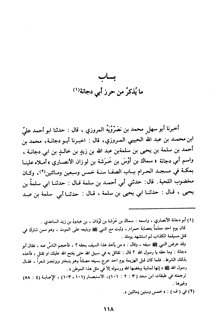 أَخْبَرَنَا أَبُو سَهْلٍ مُحَمَّدُ بْنُ نَصْرَوَيَهِ الْمَرْوَزِيُّ، قَالَ: حَدَّثَنَا أَبُو أَحْمَدَ علي ابن مُحَمَّدِ بْنِ عَبْدِ اللهِ الْحَبِيبِيُّ الْمَرْوَزِيُّ، قَالَ: أَخْبَرَنَا أَبُو دُجَانَةَ، مُحَمَّدُ بْنُ أَحْمَدَ بْنِ سَلَمَةَ بْنِ يَحْيَى بْنِ سَلَمَةَ بْنِ عَبْدِ اللهِ بْنِ زَيْدِ بْنِ خَالِدِ بْنِ أَبِي دُجَانَةَ، وَاسْمُ أَبِي دُجَانَةَ «سِمَاكُ بْنُ أَوْسِ بْنِ خَرَشَةَ بْنِ لَوْزَانَ الْأَنْصَارِيُّ» أَمْلَاهُ عَلَيْنَا بِمَكَّةَ فِي مَسْجِدِ الْحَرَامِ بِبَابِ الصَّفَا سَنَةَ خَمْسٍ وَسَبْعِينَ وَمِائَتَيْنِ [ (2) ] ، وَكَانَ مَخْضُوبَ اللِّحْيَةِ. قَالَ: حَدَّثَنِي أَبِي أَحْمَدُ بْنُ سَلَمَةَ قَالَ: حَدَّثَنَا أَبِي سَلَمَةُ بْنُ يَحْيَى، قَالَ: حَدَّثَنَا أَبِي يَحْيَى بْنُ سَلَمَةَ، قَالَ: حَدَّثَنَا أَبِي سَلَمَةَ بْنِ عَبْدِ