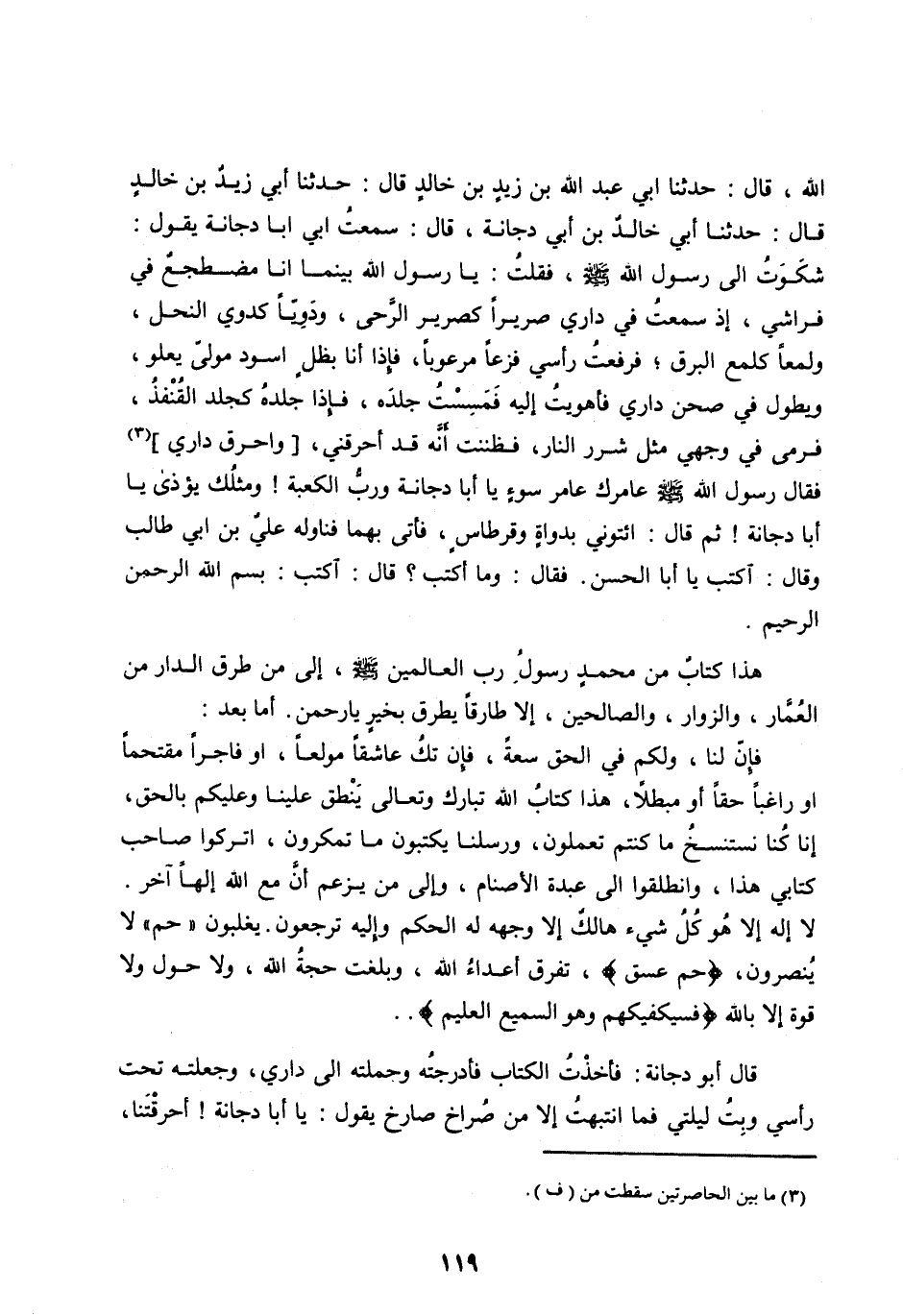 قَالَ أَبُو دُجَانَةَ: فَأَخَذْتُ الْكِتَابَ فَأَدْرَجْتُهُ وَحَمَلْتُهُ إِلَى دَارِي، وَجَعَلْتُهُ تَحْتَ رَأْسِي وَبِتُّ لَيْلَتِي فَمَا انْتَبَهْتُ إِلَّا مِنْ صُرَاخِ صَارِخٍ يَقُولُ: يَا أَبَا دُجَانَةَ! أحرقتنا،