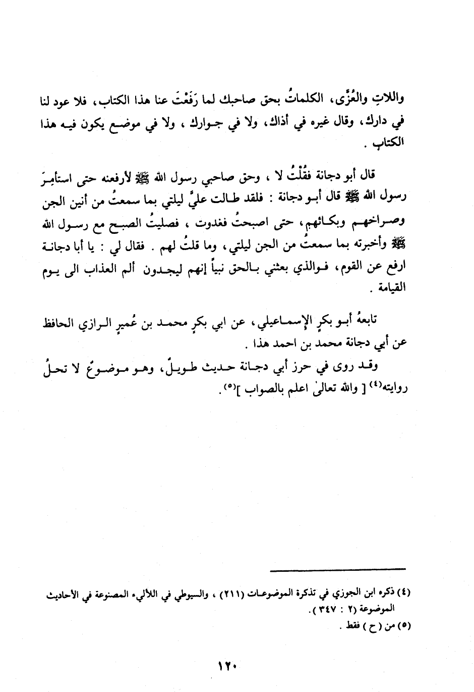 قَالَ أَبُو دُجَانَةَ فَقُلْتُ لَا، وَحَقِّ صَاحِبِي رسول الله صلى الله عليه وسلم لأرفعنه حَتَّى أَسْتَأْمِرَ رَسُولَ اللهِ صَلَّى اللهُ عَلَيْهِ وَسَلَّمَ قَالَ أَبُو دُجَانَةَ: فَلَقَدْ طَالَتْ عَلَيَّ لَيْلَتِي بِمَا سَمِعْتُ مِنْ أَنِينِ الْجِنِّ وَصُرَاخِهِمْ وَبُكَائِهِمْ، حَتَّى أَصْبَحْتُ فَغَدَوْتُ، فَصَلَّيْتُ الصُّبْحَ مَعَ رَسُولِ اللهِ صَلَّى الله عَلَيْهِ وَسَلَّمَ وَأَخْبَرْتُهُ بِمَا سَمِعْتُ مِنَ الْجِنِّ لَيْلَتِي، وَمَا قُلْتُ لَهُمْ. فَقَالَ لِي: يَا أَبَا دُجَانَةَ ارفع عن القوم، فو الذي بَعَثَنِي بِالْحَقِّ نَبِيًّا إِنَّهُمْ لَيَجِدُونَ أَلَمَ الْعَذَابِ إِلَى يَوْمِ الْقِيَامَةِ.