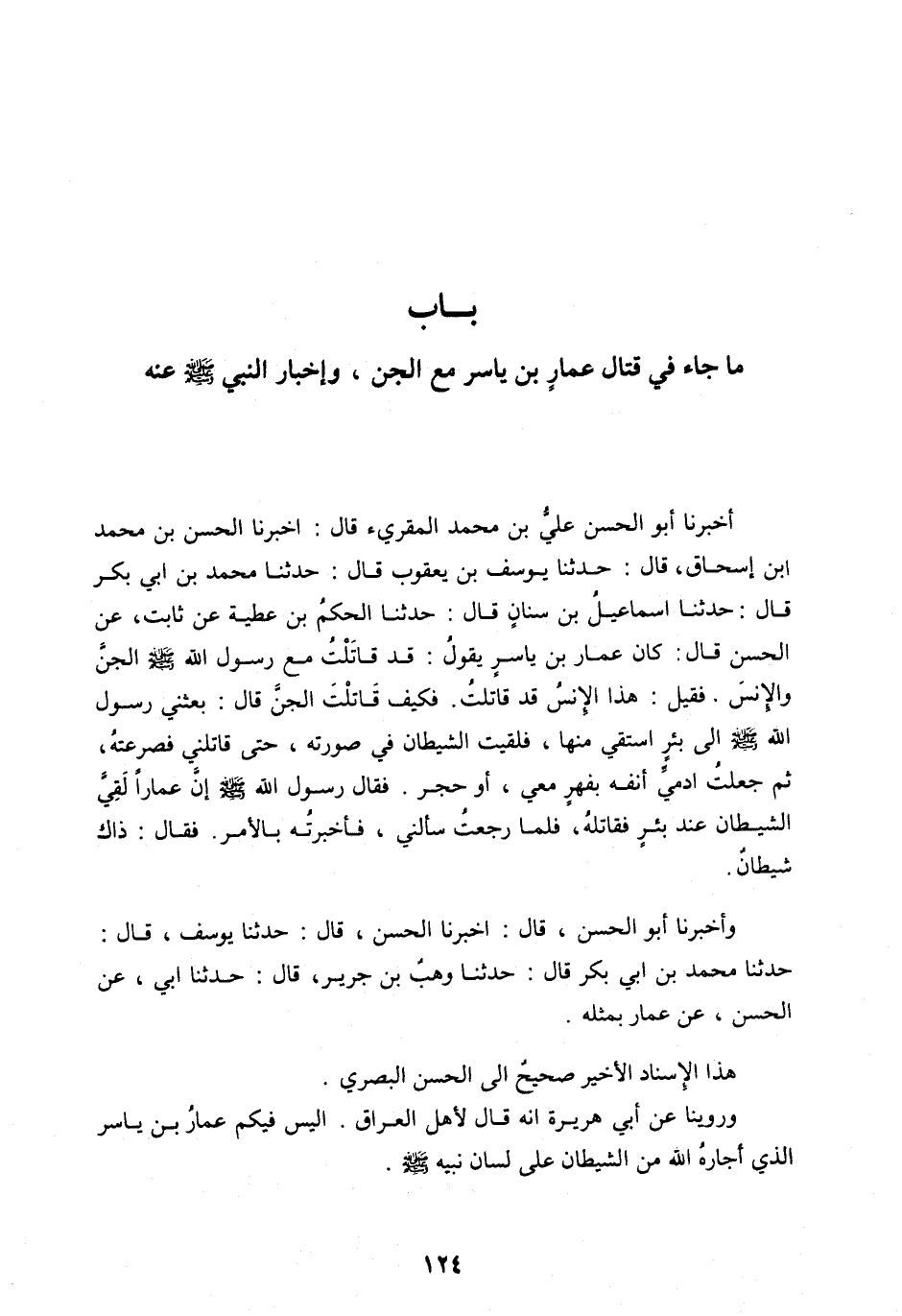 أَخْبَرَنَا أَبُو الْحَسَنِ عَلِيُّ بْنُ مُحَمَّدٍ الْمُقْرِئُ قَالَ: أَخْبَرَنَا الْحَسَنُ بْنُ محمد ابْنِ إِسْحَاقَ، قَالَ: حَدَّثَنَا يُوسُفُ بْنُ يَعْقُوبَ قَالَ: حَدَّثَنَا مُحَمَّدُ بْنُ أَبِي بَكْرٍ قَالَ: حَدَّثَنَا إِسْمَاعِيلُ بْنُ سِنَانٍ قَالَ: حَدَّثَنَا الْحَكَمُ بْنُ عَطِيَّةَ عَنْ ثَابِتٍ، عَنِ الْحَسَنِ قَالَ: كَانَ عَمَّارُ بْنُ يَاسِرٍ يَقُولُ: قَدْ قَاتَلْتُ مَعَ رَسُولِ اللهِ صَلَّى الله عَلَيْهِ وَسَلَّمَ الْجِنَّ وَالْإِنْسَ. فَقِيلَ: هَذَا الْإِنْسُ قَدْ قَاتَلْتَ. فَكَيْفَ قَاتَلْتَ الْجِنَّ قَالَ: بَعَثَنِي رَسُولُ اللهِ صَلَّى اللهُ عَلَيْهِ وسلم إِلَى بِئْرٍ أَسْتَقِي مِنْهَا، فَلَقِيتُ الشَّيْطَانَ فِي صُورَتِهِ، حَتَّى قَاتَلَنِي فَصَرَعْتُهُ، ثُمَّ جَعَلْتُ أُدْمِي أَنْفَهُ بِفِهْرٍ مَعِي، أَوْ حَجَرٍ. فَقَالَ رَسُولُ اللهِ صَلَّى الله عَلَيْهِ وَسَلَّمَ إِنَّ عَمَّارًا لَقِيَ الشَّيْطَانَ عِنْدَ بِئْرٍ فَقَاتَلَهُ، فَلَمَّا رَجَعْتُ سَأَلَنِي، فَأَخْبَرْتُهُ بِالْأَمْرِ. فَقَالَ: ذَاكَ شَيْطَانٌ.