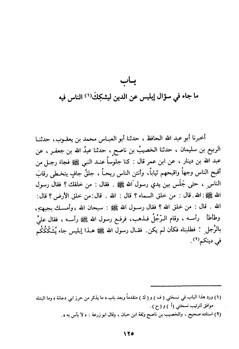 بَابُ مَا جَاءَ فِي سُؤَالِ إِبْلِيسَ عَنِ الدِّينِ لِيُشَكِّكَ [ (1) ] النَّاسَ فِيهِ