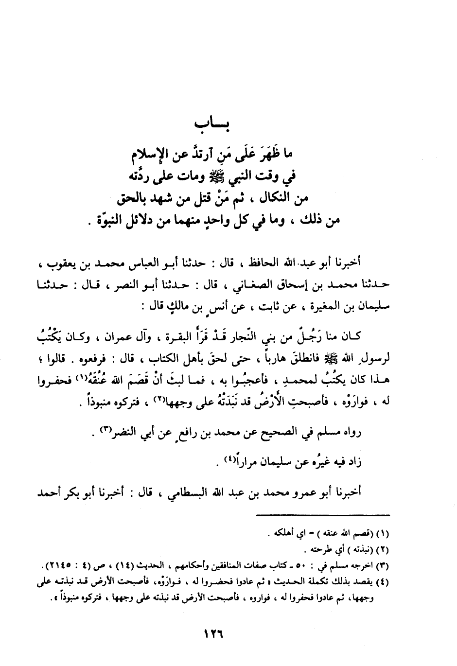 [ (4) ] يقصد بذلك تكملة الحديث «ثم عادوا فحضروا لَهُ، فَوَارَوْهُ، فَأَصْبَحَتِ الْأَرْضُ قَدْ نَبَذَتْهُ عَلَى وَجْهِهَا، ثم عادوا فَحَفَرُوا لَهُ، فَوَارَوْهُ، فَأَصْبَحَتِ الْأَرْضُ قَدْ نَبَذَتْهُ عَلَى وجهها، فتركوه منبوذا» .