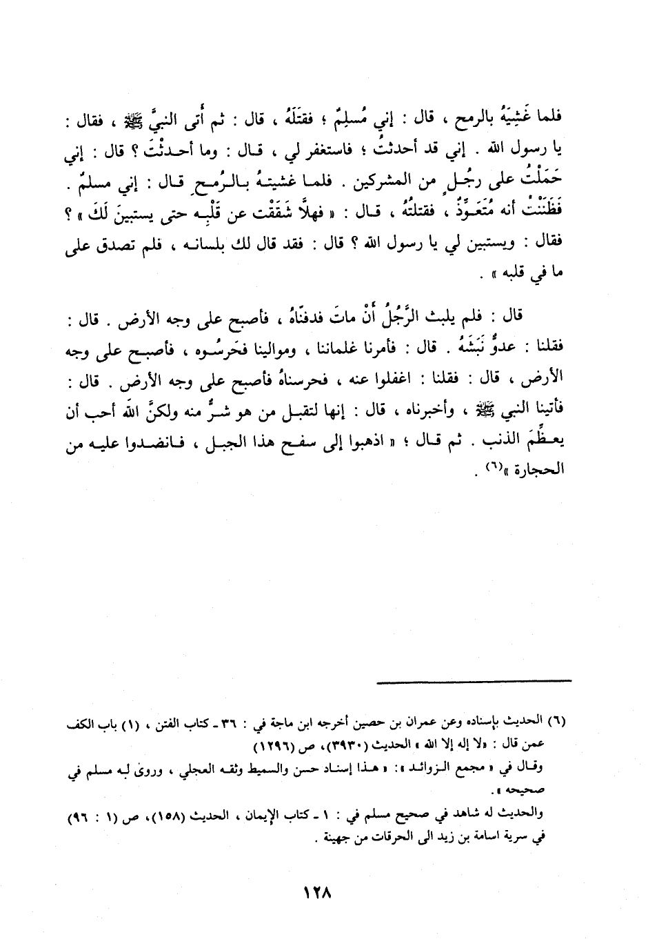 [ (6) ] الحديث بإسناده وعن عمران بن حصين أخرجه ابن ماجة في: 36- كتاب الفتن، (1) باب الكف عمن قَالَ: «لَا إِلَهَ إِلَّا اللهُ» الحديث (3930) ، ص (1296) وقال في «مجمع الزوائد» : «هذا إسناد حسن والسميط وثقه العجلي، وروى له مسلم في صحيحه» .