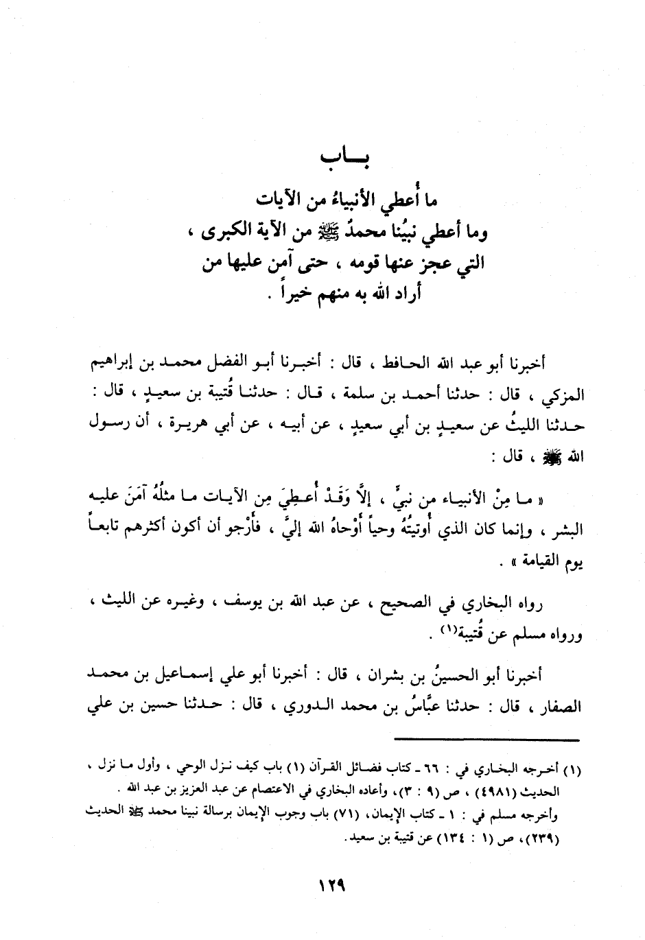 حَدَّثَنَا اللَّيْثُ عَنْ سَعِيدِ بْنِ أَبِي سَعِيدٌ، عَنْ أَبِيهِ، عَنْ أَبِي هُرَيْرَةَ، أَنَّ رَسُولَ اللهِ صَلَّى الله عليه وَسَلَّمَ، قَالَ: «مَا مِنَ الْأَنْبِيَاءِ مِنْ نَبِيٍّ، إِلَّا وَقَدْ أُعْطِيَ مِنَ الْآيَاتِ ما مثله من عَلَيْهِ الْبَشَرُ، وَإِنَّمَا كَانَ الَّذِي أُوتِيتُهُ وَحْيًا أَوْحَاهُ اللهُ إِلَيَّ، فَأَرْجُو أَنْ أَكُونَ أَكْثَرَهُمْ تَابِعًا يَوْمَ الْقِيَامَةِ» .