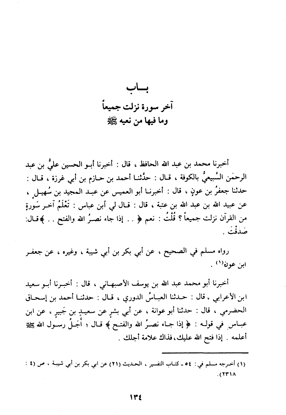 أَخْبَرَنَا أَبُو مُحَمَّدٍ عَبْدُ اللهِ بْنُ يُوسُفَ الْأَصْبَهَانِيُّ، قَالَ: أَخْبَرَنَا أبو سعيد ابن الْأَعْرَابِيِّ، قَالَ: حَدَّثَنَا الْعَبَّاسُ الدُّورِيُّ، قَالَ: حَدَّثَنَا أَحْمَدُ بْنُ إِسْحَاقَ الْحَضْرَمِيُّ، قَالَ: حَدَّثَنَا أَبُو عَوَانَةَ، عَنْ أَبِي بِشْرٍ عَنْ سَعِيدِ بْنِ جُبَيْرٍ، عَنِ ابْنِ عَبَّاسٍ فِي قَوْلِهِ: إِذا جاءَ نَصْرُ اللَّهِ وَالْفَتْحُ قَالَ، أَجَلُ رَسُولِ اللهِ صَلَّى اللهُ عَلَيْهِ وسلم أَعْلَمَهُ. إِذَا فَتَحَ اللهُ عَلَيْكَ، فَذَاكَ عَلَامَةُ أَجَلِكَ.