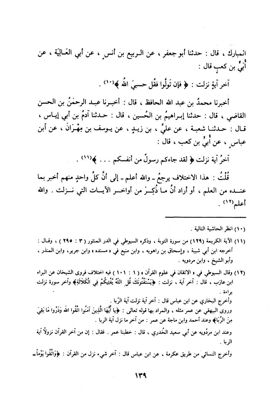 [ (12) ] وقال السيوطي في «الإتقان في علوم القرآن» (1: 101) فيه اختلاف فروى الشيخان عن البراء ابن عازب، قَالَ: آخِرُ آيَةٍ، نَزَلَتْ: يَسْتَفْتُونَكَ قُلِ اللَّهُ يُفْتِيكُمْ فِي الْكَلالَةِ وآخر سورة نزلت براءة.