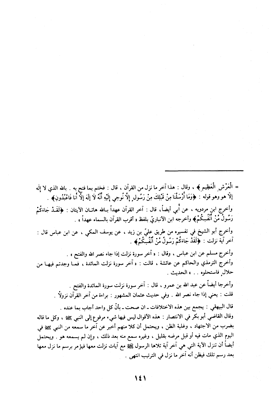 وقال القاضي أبو بكر في الانتصار: هذه الأقوال ليس فيها شيء مرفوع إلى النبي صلّى الله عليه وسلم، وكل ما قاله بضرب من الاجتهاد، وغلبة الظن، ويحتمل أن كلا منهم أخبر عن آخر ما سمعه من النبي صلّى الله عليه وسلم في اليوم الذي مات فيه أو قبل مرضه بقليل، وغيره سمع منه بعد ذلك، وإن لم يسمعه هو. ويحتمل أيضا أن تنزل الآية التي هي آخر آية تلاها الرسول صلّى الله عليه وسلم مع آيات نزلت معها فيؤمر برسم ما نزل معها بعد رسم تلك فيظن أنه آخر ما نزل في الترتيب انتهى.