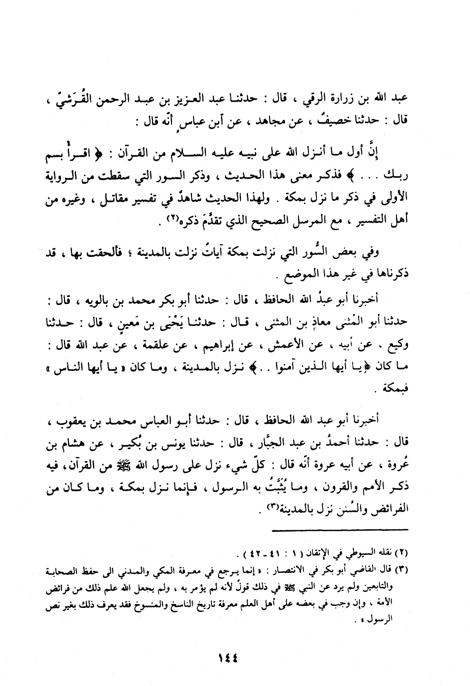 [ (3) ] قال القاضي أبو بكر في الانتصار: «إنما يرجع في معرفة المكي والمدني الى حفظ الصحابة والتابعين ولم يرد عَنِ النَّبِيِّ صَلَّى اللهُ عَلَيْهِ وَسَلَّمَ فِي ذَلِكَ قول لأنه لم يؤمر به، ولم يجعل الله علم ذلك من فرائض الأمة، وإن وجب في بعضه على أهل العلم معرفة تاريخ الناسخ والمنسوخ فقد يعرف ذلك بغير نص الرسول» .