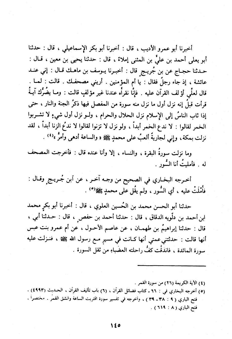 [ (5) ] أخرجه البخاري في: 66- كتاب فضائل القرآن، (6) باب تأليف القرآن، الحديث (4993) ، فتح الباري (9: 38- 39) ، وأخرجه في تفسير سورة اقتربت الساعة وانشق القمر، مختصرا، فتح الباري (8: 619) .