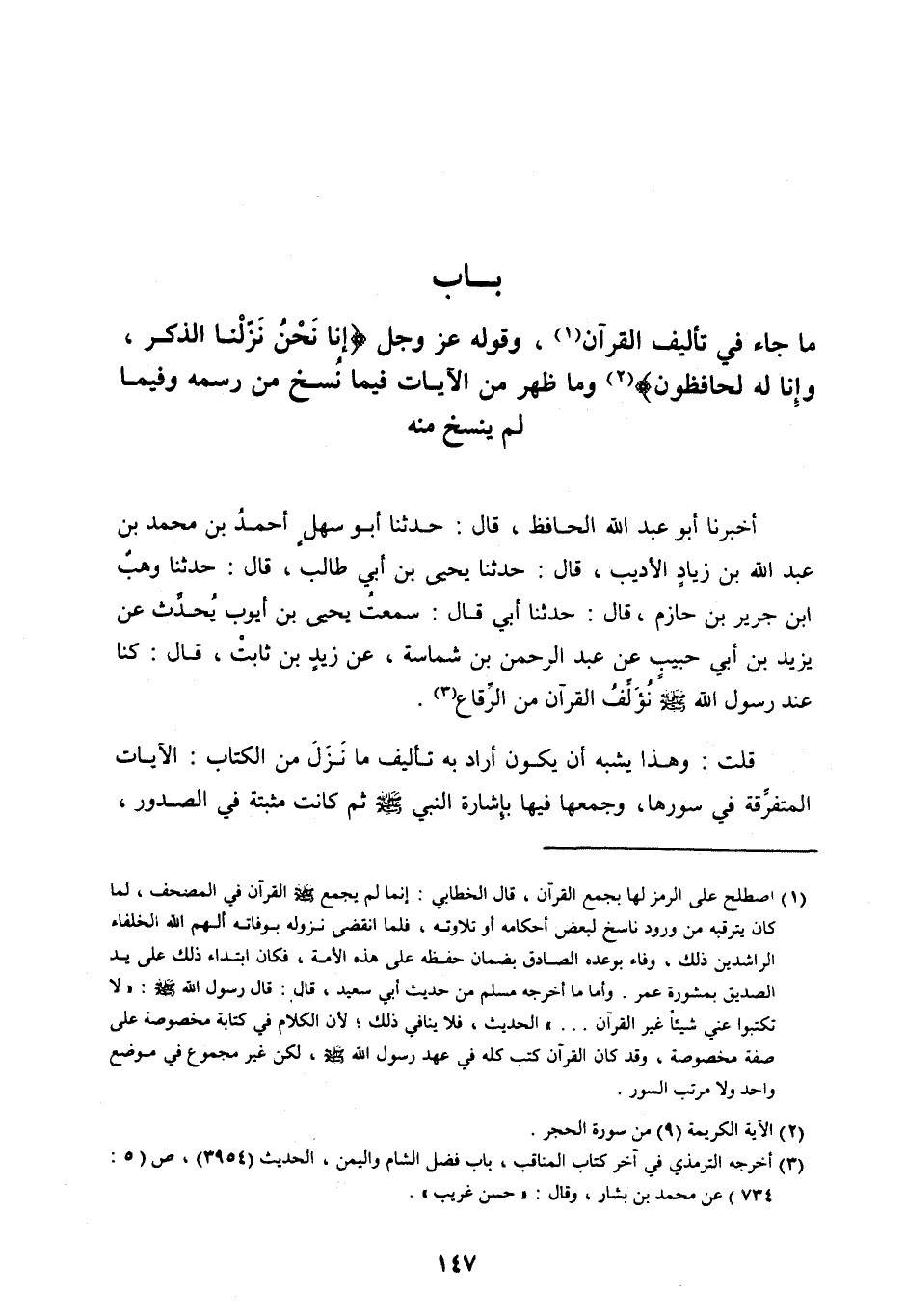 بَابُ مَا جَاءَ فِي تَأْلِيفِ الْقُرْآنِ [ (1) ] ، وَقَوْلِهِ عَزَّ وَجَلَّ إِنَّا نَحْنُ نَزَّلْنَا الذِّكْرَ، وَإِنَّا لَهُ لَحافِظُونَ [ (2) ] وَمَا ظَهَرَ مِنَ الْآيَاتِ فِيمَا نُسِخَ مِنْ رَسْمِهِ وَفِيمَا لَمْ يُنْسَخْ مِنْهُ