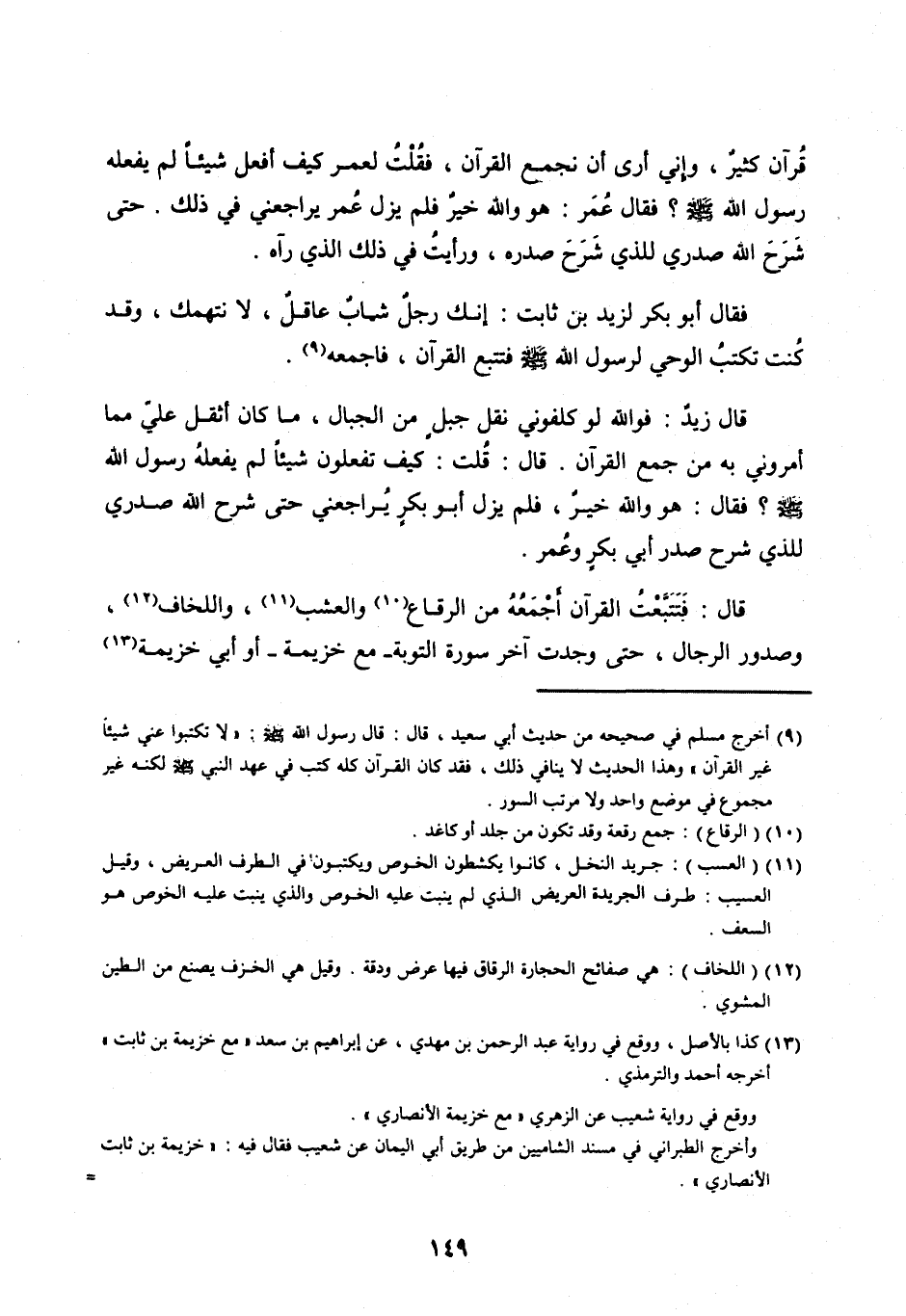 قَالَ: فَتَتَبَّعْتُ الْقُرْآنَ أَجْمَعُهُ من الرقاع [ (10) ] والعشب [ (11) ] ، وَاللِّخَافِ [ (12) ] ، وَصُدُورِ الرِّجَالِ، حَتَّى وَجَدْتُ آخِرَ سُورَةِ التَّوْبَةِ- مَعَ خُزَيْمَةَ- أَوْ أَبِي خزيمة [ (13) ]