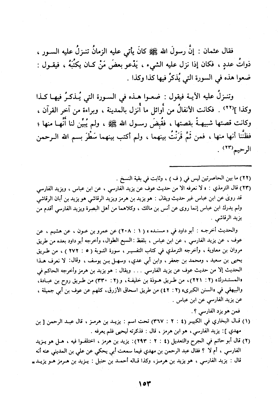 وَتَنْزِلُ عَلَيْهِ الْآيَةُ فَيَقُولُ: ضَعُوا هَذِهِ فِي السُّورَةِ الَّتِي يُذْكَرُ فِيهَا كَذَا وَكَذَا] [ (22) ] . فَكَانَتِ الْأَنْفَالُ مِنْ أَوَائِلِ مَا أُنْزِلَ بِالْمَدِينَةِ، وبراءة مِنْ آخِرِ الْقُرْآنِ، وَكَانَتْ قِصَّتُهَا شَبِيهَةٌ بِقِصَّتِهَا، فَقُبِضَ رَسُولُ اللهِ صَلَّى اللهُ عَلَيْهِ وَسَلَّمَ، وَلَمْ يُبَيِّنْ لَنَا أَنَّهَا مِنْهَا، فَظَنَنَّا أَنَّهَا مِنْهَا، فَمِنْ ثَمَّ قَرَنْتُ بَيْنَهُمَا، وَلَمْ أَكْتُبْ بَيْنَهُمَا سَطْرَ بِسْمِ اللهِ الرَّحْمَنِ الرَّحِيمِ [ (23) ] .