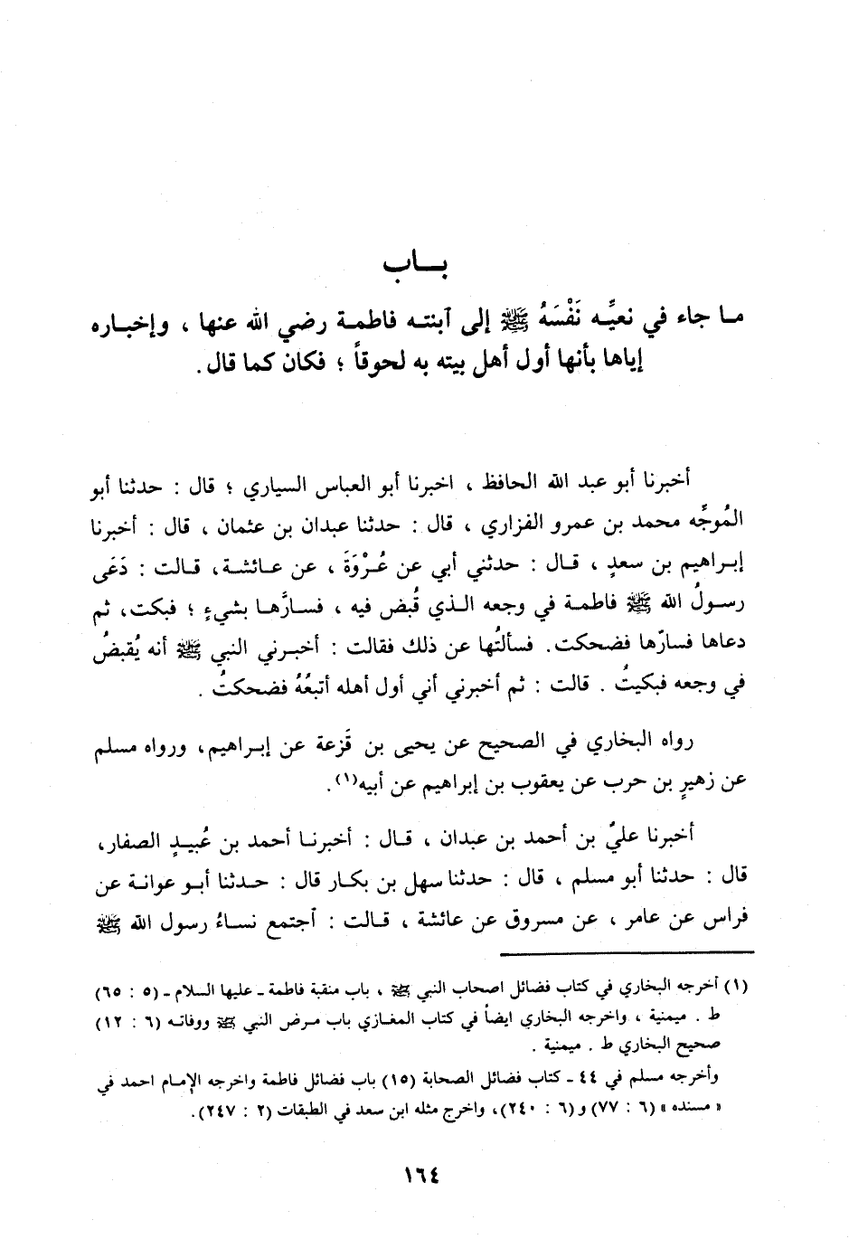 [ (1) ] أَخْرَجَهُ الْبُخَارِيُّ فِي كتاب فضائل أصحاب النبي صلى الله عليه وسلم، باب منقبة فاطمة- عليها السلام- (5: 65) ط. ميمنية، وأخرجه البخاري ايضا في كتاب المغازي باب مَرِضَ النَّبِيُّ صَلَّى اللهُ عليه وسلم ووفاته (6: 12) صحيح البخاري ط. ميمنية.