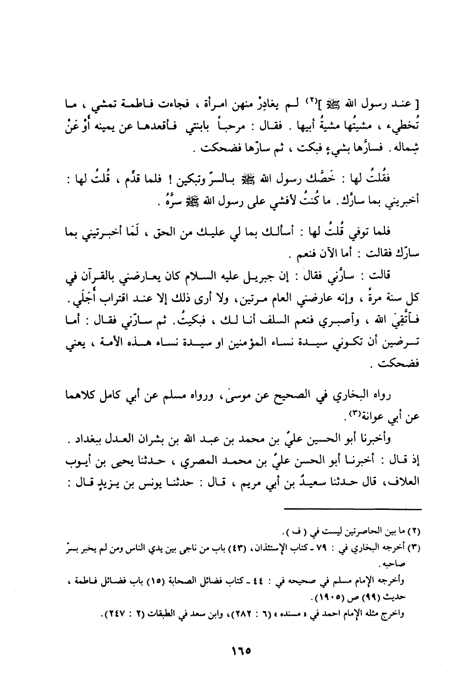 فَقُلْتُ لَهَا: خَصَّكِ رَسُولُ اللهِ صَلَّى اللهُ عَلَيْهِ وَسَلَّمَ بِالسِّرِّ وَتَبْكِينَ! فَلَمَّا قُدِّمَ، قُلْتُ لَهَا: