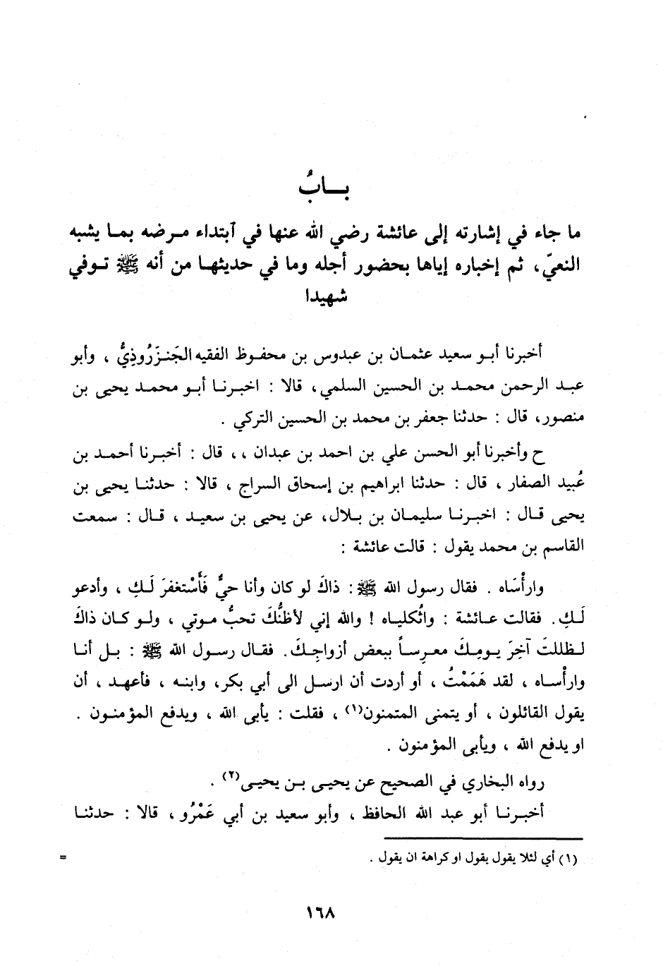 بَابُ مَا جَاءَ فِي إِشَارَتِهِ إِلَى عَائِشَةَ رَضِيَ اللهُ عَنْهَا فِي ابْتِدَاءِ مَرَضِهِ بِمَا يُشْبِهُ النَّعْيَ، ثُمَّ إِخْبَارِهِ إِيَّاهَا بِحُضُورِ أَجَلِهِ وَمَا فِي حَدِيثِهَا مِنْ أَنَّهُ صَلَّى اللهُ عَلَيْهِ وَسَلَّمَ تُوُفِّيَ شَهِيدًا