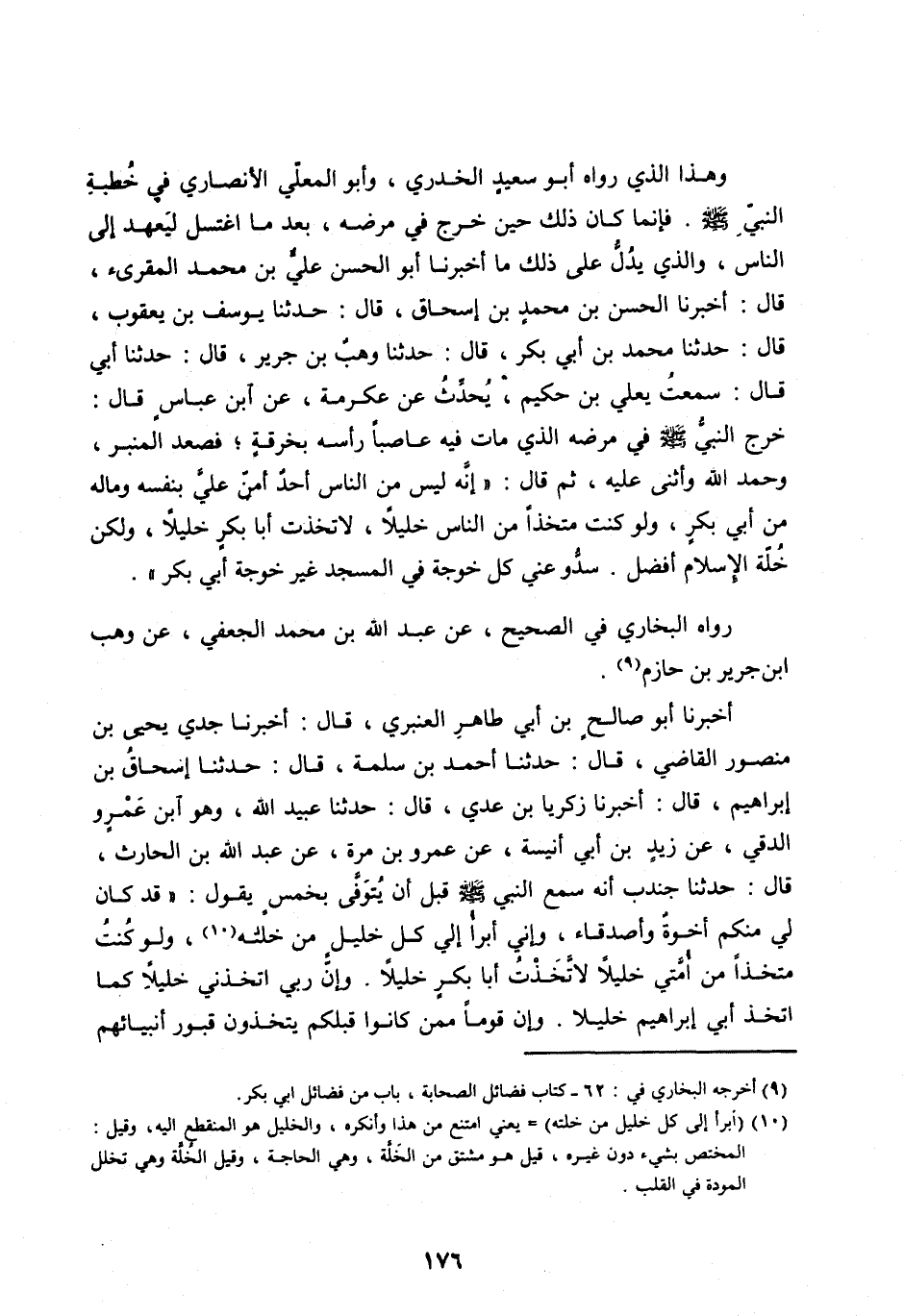 أَخْبَرَنَا أَبُو صَالِحِ بْنُ أَبِي طَاهِرٍ الْعَنْبَرِيُّ، قَالَ: أَخْبَرَنَا جَدِّي يَحْيَى بْنُ مَنْصُورٍ الْقَاضِي، قَالَ: حَدَّثَنَا أَحْمَدُ بْنُ سَلَمَةَ، قَالَ: حَدَّثَنَا إِسْحَاقُ بْنُ إِبْرَاهِيمَ، قَالَ: أَخْبَرَنَا زَكَرِيَّا بْنُ عَدِيٍّ، قَالَ: حَدَّثَنَا عُبَيْدُ اللهِ، وَهُوَ ابْنُ عَمْرٍو الدُّقِيُّ، عَنْ زَيْدِ بْنِ أَبِي أُنَيْسَةَ، عَنْ عَمْرِو بْنِ مُرَّةَ، عَنْ عَبْدِ اللهِ بْنِ الْحَارِثِ، قَالَ: حَدَّثَنَا جُنْدُبٌ أَنَّهُ سَمِعَ النَّبِيَّ صَلَّى اللهُ عَلَيْهِ وَسَلَّمَ قَبْلَ أَنْ يُتَوَفَّى بِخَمْسٍ يَقُولُ: «قَدْ كَانَ لِي مِنْكُمْ إِخْوَةٌ وَأَصْدِقَاءُ، وَإِنِّي أَبْرَأُ إِلَى كُلِّ خَلِيلٍ مِنْ خُلَّتِهِ [ (10) ] ، وَلَوْ كُنْتُ مُتَّخِذًا مِنْ أُمَّتِي خَلِيلًا لَاتَّخَذْتُ أَبَا بَكْرٍ خَلِيلًا. وَإِنَّ رَبِّي اتَّخَذَنِي خَلِيلًا كَمَا اتَّخَذَ أَبِي إِبْرَاهِيمَ خَلِيلًا. وَإِنَّ قَوْمًا مِمَّنْ كانوا قبلكم يتخذون قبور أنبيائهم
