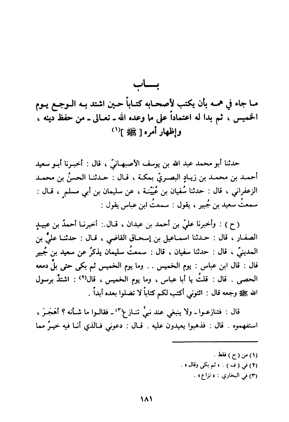 سَمِعْتُ سَعِيدَ بْنِ جُبَيْرٍ، يَقُولُ: سَمِعْتُ ابْنَ عَبَّاسٍ يَقُولُ: (ح) : وَأَخْبَرَنَا عَلِيُّ بْنُ أَحْمَدَ بْنِ عَبْدَانَ، قَالَ: أَخْبَرَنَا أَحْمَدُ بْنُ عُبَيْدٍ الصَّفَّارُ، قَالَ: حَدَّثَنَا إِسْمَاعِيلُ بْنُ إِسْحَاقَ الْقَاضِي، قَالَ: حَدَّثَنَا عَلِيُّ بْنُ الْمَدِينِيِّ، قَالَ: حَدَّثَنَا سُفْيَانُ، قَالَ: سَمِعْتُ سُلَيْمَانَ يَذْكُرُ عَنْ سَعِيدِ بْنِ جُبَيْرٍ قَالَ: قَالَ ابْنُ عَبَّاسٍ: يَوْمَ الْخَمِيسِ.. وَمَا يَوْمُ الْخَمِيسِ ثُمَّ بَكَى حَتَّى بَلَّ دَمْعُهُ الْحَصَى. قَالَ: قُلْتُ يَا أَبَا عَبَّاسٍ، وَمَا يَوْمُ الْخَمِيسِ، قَالَ [ (2) ] : اشْتَدَّ بِرَسُولِ اللهِ صَلَّى اللهُ عليه وسلم وَجَعُهُ قَالَ: ائْتُونِي أَكْتُبْ لَكُمْ كِتَابًا لَا تَضِلُّوا بَعْدَهُ أَبَدًا.