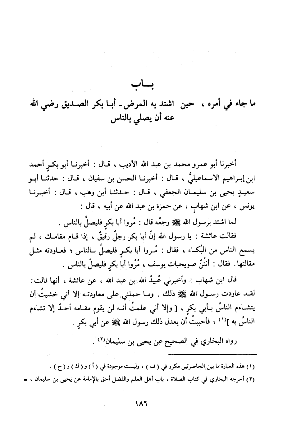 [ (2) ] أخرجه البخاري في كتاب الصلاة، باب أهل العلم والفضل أحق بالإمامة عَنْ يَحْيَى بْنِ سُلَيْمَانَ،