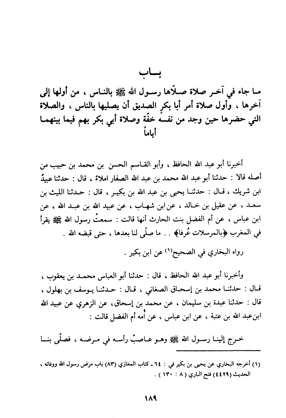 أَخْبَرَنَا أَبُو عبد الله الحافظ، وأَبُو الْقَاسِمِ الْحَسَنُ بْنُ مُحَمَّدِ بْنِ حُبَيْبٍ مِنْ أَصْلِهِ قَالَا: حَدَّثَنَا أَبُو عَبْدِ اللهِ مُحَمَّدُ بْنُ عَبْدِ اللهِ الصَّفَّارُ إِمْلَاءً، قَالَ: حدثنا عبيد ابن شَرِيكٍ، قَالَ: حَدَّثَنَا يَحْيَى بْنُ عَبْدِ اللهِ بْنِ بُكَيْرٍ، قَالَ: حَدَّثَنَا اللَّيْثُ بْنُ سَعْدٍ، عَنْ عُقَيْلٍ بن خالد، عن بْنِ شِهَابٍ، عَنْ عُبَيْدِ اللهِ بْنِ عَبْدِ اللهِ، عَنِ ابْنِ عَبَّاسٍ، عَنْ أُمِّ الْفَضْلِ بِنْتِ الْحَارِثِ أَنَّهَا قَالَتْ: سَمِعْتُ رَسُولَ اللهِ صَلَّى اللهُ عَلَيْهِ وسلم يقرأ في المغرب (وَالْمُرْسَلاتِ عُرْفاً) .. مَا صَلَّى لَنَا بَعْدَهَا، حَتَّى قَبَضَهُ اللهُ.