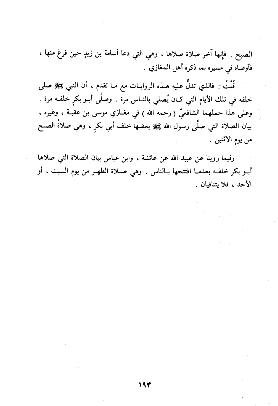 وَعَلَى هَذَا حَمَلَهُمَا الشَّافِعِيُّ (رَحِمَهُ اللهُ) فِي مَغَازِي مُوسَى بْنِ عُقْبَةَ، وَغَيْرِهِ، بَيَانُ الصَّلَاةِ الَّتِي صَلَّى رَسُولُ اللهِ صَلَّى الله عليه وَسَلَّمَ بَعْضَهَا خَلْفَ أَبِي بَكْرٍ، وَهِيَ صَلَاةُ الصُّبْحِ مِنْ يَوْمِ الِاثْنَيْنِ.