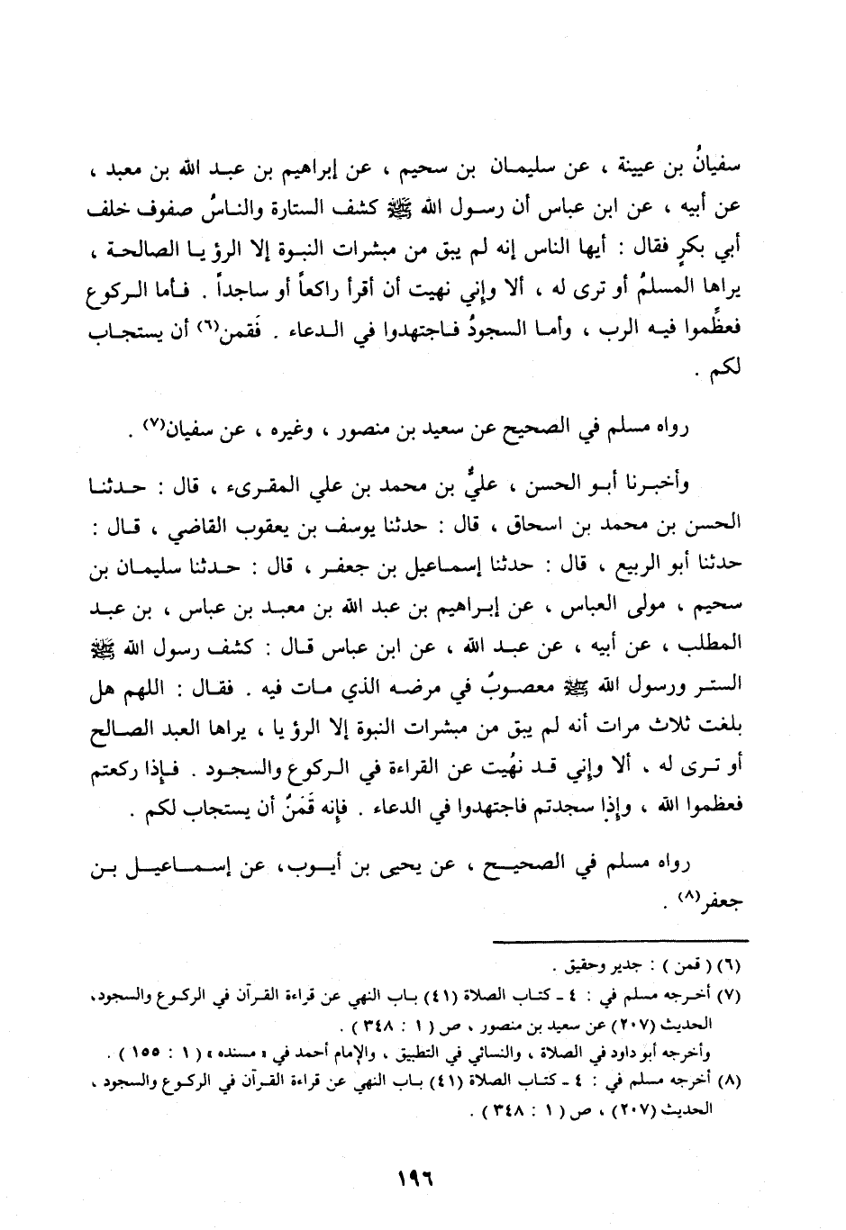 سُفْيَانُ بْنُ عُيَيْنَةَ، عَنْ سُلَيْمَانَ بْنِ سُحَيْمٍ، عَنْ إِبْرَاهِيمَ بْنِ عَبْدِ اللهِ بْنِ مَعْبَدٍ، عَنْ أَبِيهِ، عَنِ ابْنِ عَبَّاسٍ أَنَّ رَسُولَ اللهِ صَلَّى الله عَلَيْهِ وَسَلَّمَ كَشَفَ السِّتَارَةَ وَالنَّاسُ صُفُوفٌ خَلْفَ أَبِي بَكْرٍ فَقَالَ: أَيُّهَا النَّاسُ إِنَّهُ لم يبق من مُبَشِّرَاتِ النُّبُوَّةِ إِلَّا الرُّؤْيَا الصَّالِحَةِ، يَرَاهَا الْمُسْلِمُ أَوْ تُرَى لَهُ، أَلَا وَإِنِّي نُهِيتُ أَنْ أَقْرَأَ رَاكِعًا أَوْ سَاجِدًا. فَأَمَّا الرُّكُوعُ فَعَظِّمُوا فِيهِ الرَّبَّ، وَأَمَّا السُّجُودُ فَاجْتَهِدُوا فِي الدُّعَاءِ. فَقَمِنٌ [ (6) ] أَنْ يُسْتَجَابَ لَكُمْ.