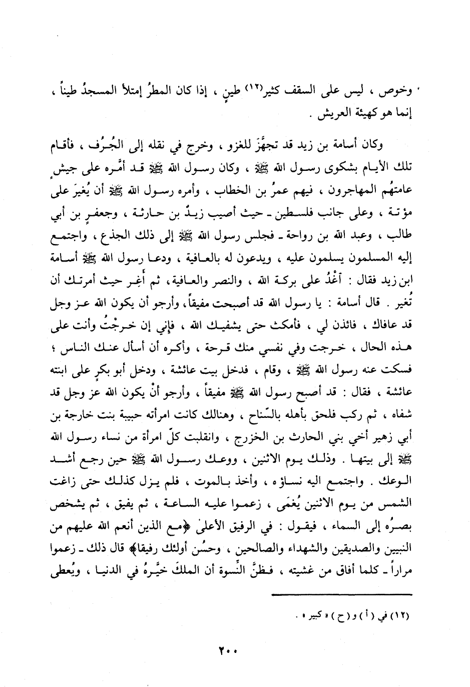 وَكَانَ أُسَامَةُ بْنُ زَيْدٍ قَدْ تَجَهَّزَ لِلْغَزْوِ، وَخَرَجَ فِي نَقْلِهِ إِلَى الْجُرُفِ، فَأَقَامَ تِلْكَ الْأَيَّامَ بِشَكْوَى رسول الله صلى الله عَلَيْهِ وَسَلَّمَ، وَكَانَ رَسُولُ اللهِ صَلَّى الله عليه وَسَلَّمَ قَدْ أَمَّرَهُ عَلَى جيش عامتهم الْمُهَاجِرُونَ، فِيهِمْ عُمَرُ بْنُ الْخَطَّابِ، وَأَمَرَهُ رَسُولُ اللهِ صَلَّى الله عليه وسلم أَنْ يُغِيرَ عَلَى مُؤْتَةَ، وَعَلَى جَانِبِ فِلَسْطِينَ- حَيْثُ أُصِيبَ زَيْدُ بْنُ حَارِثَةَ، وَجَعْفَرُ بْنُ أَبِي طَالِبِ، وَعَبْدِ اللهِ بْنُ رَوَاحَةَ- فَجَلَسَ رَسُولُ اللهِ صَلَّى اللهُ عَلَيْهِ وَسَلَّمَ إِلَى ذَلِكَ الْجِذْعِ، وَاجْتَمَعَ إِلَيْهِ الْمُسْلِمُونَ يُسَلِّمُونَ عَلَيْهِ، وَيَدْعُونَ لَهُ بِالْعَافِيَةِ، وَدَعَا رَسُولُ اللهِ صَلَّى اللهُ عَلَيْهِ وَسَلَّمَ أُسَامَةَ ابن زَيْدٍ فَقَالَ: اغْدُ عَلَى بَرَكَةِ اللهِ، وَالنَّصْرِ وَالْعَافِيَةِ، ثُمَّ أَغِرْ حَيْثُ أَمَرْتُكَ أَنْ تُغِيرَ. قَالَ أُسَامَةُ: يَا رَسُولَ اللهِ قَدْ أَصْبَحْتَ مُفِيقًا، وَأَرْجُو أَنْ يكون اللهَ عَزَّ وَجَلَّ قَدْ عافاك، فائذن لِي، فَأَمْكُثَ حَتَّى يَشْفِيَكَ اللهُ، فَإِنِّي إِنْ خَرَجْتُ وَأَنْتَ عَلَى هَذِهِ الْحَالِ، خَرَجْتُ وَفِي نَفْسِي مِنْكَ قُرْحَةٌ، وَأَكْرَهُ أَنْ أَسْأَلَ عَنْكَ النَّاسَ، فَسَكَتَ عَنْهُ رَسُولِ الله صلى اللهُ عَلَيْهِ وَسَلَّمَ،
