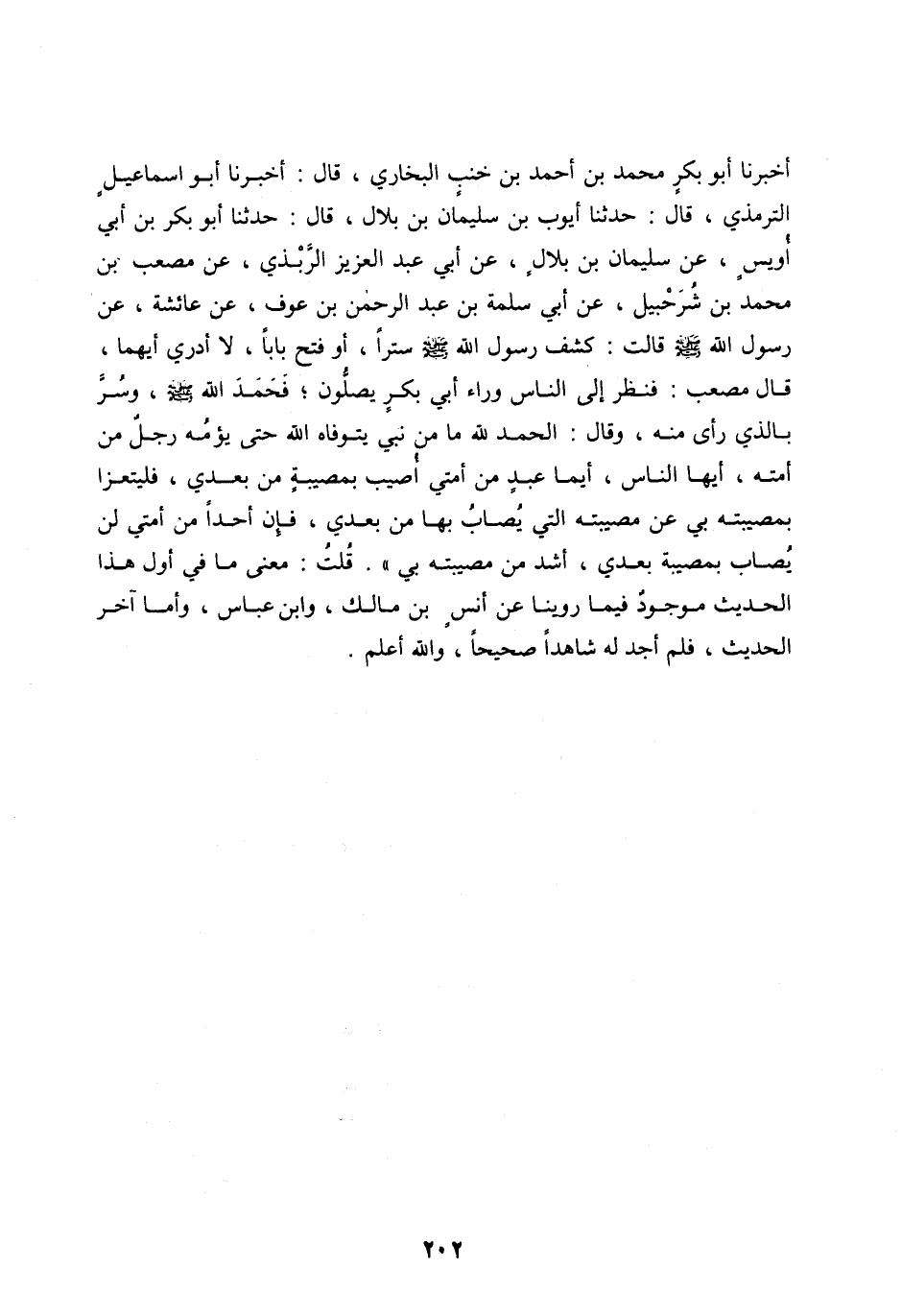 أَخْبَرَنَا أَبُو بَكْرٍ مُحَمَّدُ بْنُ أَحْمَدَ بْنِ خَنْبٍ الْبُخَارِيُّ، قَالَ: أَخْبَرَنَا أَبُو إِسْمَاعِيلَ التِّرْمِذِيُّ، قَالَ: حَدَّثَنَا أَيُّوبُ بْنُ سُلَيْمَانَ بْنِ بِلَالٍ، قَالَ: حَدَّثَنَا أَبُو بَكْرِ بْنُ أَبِي أُوَيْسٍ، عَنْ سُلَيْمَانَ بْنِ بِلَالٍ، عَنْ أَبِي عَبْدِ الْعَزِيزِ الرَّبَذِيُّ، عَنْ مُصْعَبِ بْنِ مُحَمَّدِ بْنِ شُرَحْبِيلَ، عَنْ أَبِي سَلَمَةَ بْنِ عَبْدِ الرَّحْمَنِ بْنِ عَوْفٍ، عَنْ عَائِشَةَ، عَنْ رَسُولِ اللهِ صَلَّى اللهُ عَلَيْهِ وَسَلَّمَ قَالَتْ: كَشَفَ رَسُولُ اللهِ صَلَّى اللهُ عَلَيْهِ وسلم سِتْرًا، أَوْ فَتْحَ بَابًا، لَا أَدْرِي أَيُّهُمَا، قَالَ مُصْعَبٌ: فَنَظَرَ إِلَى النَّاسِ وَرَاءَ أَبِي بَكْرٍ يُصَلُّونَ، فَحَمِدَ اللهَ صَلَّى اللهُ عَلَيْهِ وَسَلَّمَ، وَسُرَّ بِالَّذِي رَأَى مِنْهُ، وَقَالَ: الْحَمْدُ لِلَّهِ مَا مِنْ نَبِيٍّ يَتَوَفَّاهُ اللهُ حَتَّى يَؤُمَّهُ رَجُلٌ مِنْ أُمَّتِهِ، أَيُّهَا النَّاسُ، أَيُّمَا عَبْدٌ مِنْ أُمَّتِي أُصِيبَ بِمُصِيبَةٍ مِنْ بعدي، فليتعزا بِمُصِيبَتِهِ بِي عَنْ مُصِيبَتِهِ الَّتِي يُصَابُ بِهَا مِنْ بَعْدِي، فَإِنَّ أَحَدًا مِنْ أُمَّتِي لَنْ يُصَابَ بِمُصِيبَةٍ بَعْدِي، أَشَدَّ مِنْ مُصِيبَتِهِ بِي» .