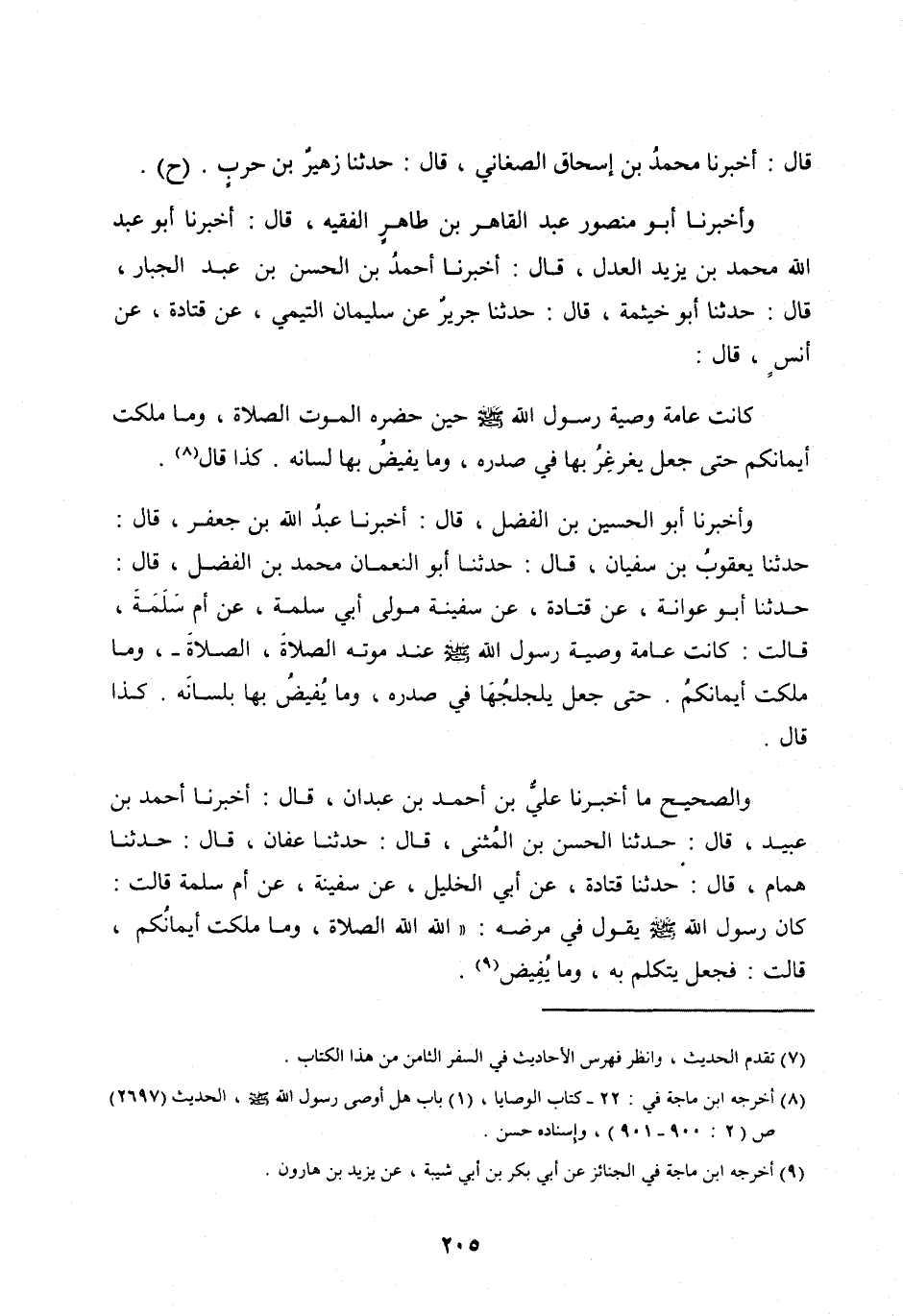 وَالصَّحِيحُ مَا أَخْبَرَنَا عَلِيُّ بْنُ أَحْمَدَ بْنِ عَبْدَانَ، قَالَ: أَخْبَرَنَا أَحْمَدُ بْنُ عُبَيْدٍ، قَالَ: حَدَّثَنَا الْحَسَنُ بْنُ الْمُثَنَّى، قَالَ: حَدَّثَنَا عَفَّانُ، قَالَ: حَدَّثَنَا هَمَّامٌ، قَالَ: حَدَّثَنَا قَتَادَةُ، عَنْ أَبِي الْخَلِيلِ، عَنْ سَفِينَةَ، عَنْ أُمِّ سَلَمَةَ قَالَتْ: كَانَ رَسُولُ اللهِ صَلَّى اللهُ عَلَيْهِ وَسَلَّمَ يَقُولُ فِي مَرَضِهِ: «اللهَ اللهَ الصَّلَاةَ، وَمَا مَلَكَتْ أَيْمَانُكُمْ، قَالَتْ: فَجَعَلَ يَتَكَلَّمُ به، وما يفيض [ (9) ] .